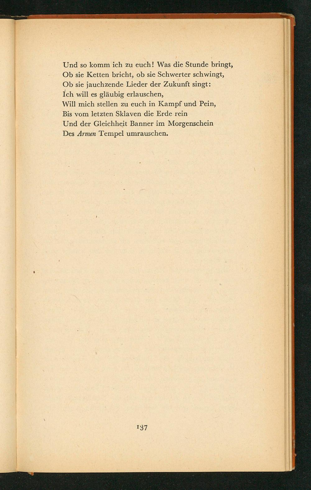 Und so komm ich zu euch! Was die Stunde bringt, Ob sie Ketten bricht, ob sie Schwerter schwingt, Ob sie jauchzende Lieder der Zukunft singt: