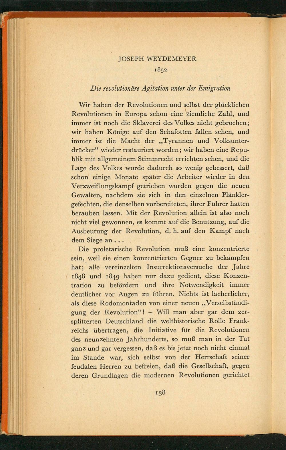 Wir haben der Revolutionen und selbst der glücklichen Revolutionen in Europa schon eine"ziemliche Zahl, und immer ist noch die Sklaverei des Volkes nicht gebrochen; wir haben Könige auf den Schafotten fallen sehen, und immer ist die Macht der ‚„Tyrannen und Volksunter- drücker‘‘ wieder restauriert worden; wir haben eine Repu- blik mit allgemeinem Stimmrecht errichten sehen, und die Lage des Volkes wurde dadurch so wenig gebessert, daß schon einige Monate später die Arbeiter wieder in den Verzweiflungskampf getrieben wurden gegen die neuen Gewalten, nachdem sie sich in den einzelnen Plänkler- gefechten, die denselben vorbereiteten, ihrer Führer hatten berauben lassen. Mit der Revolution allein ist also noch nicht viel gewonnen, es kommt auf die Benutzung, auf die Ausbeutung der Revolution, d.h. auf den Kampf nach dem Siege an...