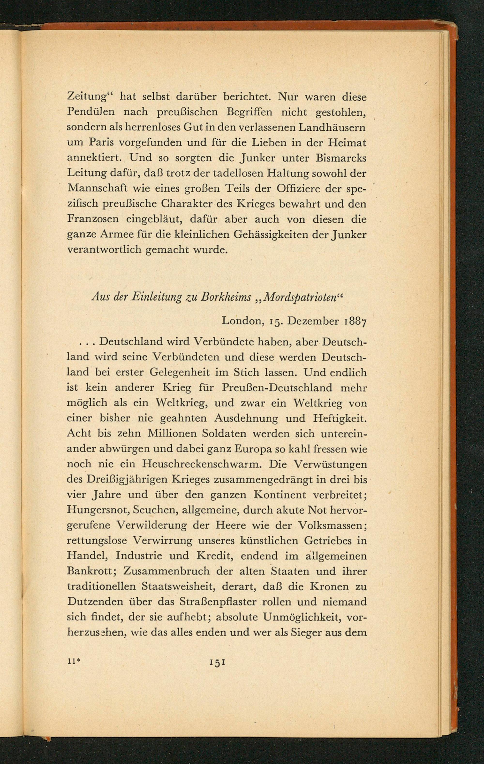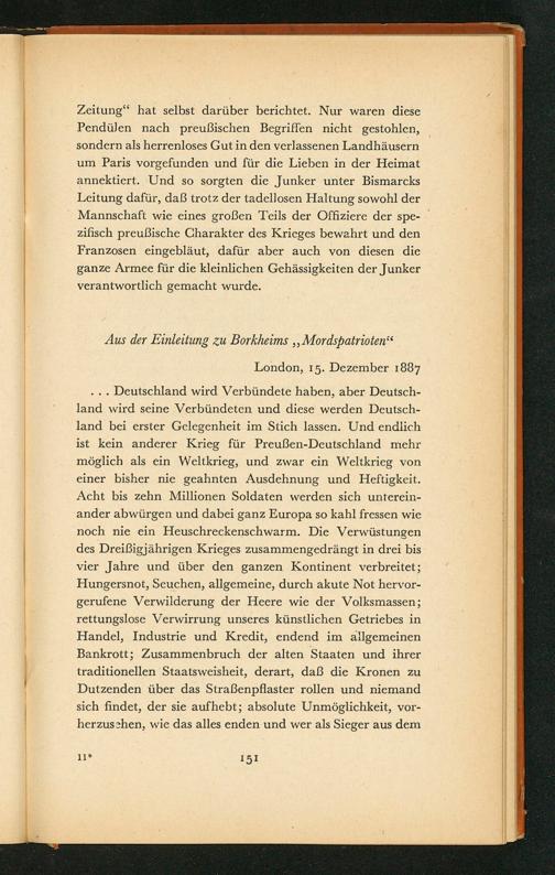 Zeitung" hat selbst darüber berichtet. Nur waren diese Pendülen nach preußischen Begriffen nicht gestohlen, sondern als herrenloses Gut in den verlassenen Landhäusern um Paris vorgefunden und für die Lieben in der Heimat annektiert. Und so sorgten die Junker unter Bismarcks Leitung dafür, daß trotz der tadellosen Haltung sowohl der Mannschaft wie eines großen Teils der Offiziere der spezifisch preußische Charakter des Krieges bewahrt und den Franzosen eingebläut, dafür aber auch von diesen die ganze Armee für die kleinlichen Gehässigkeiten der Junker verantwortlich gemacht wurde.