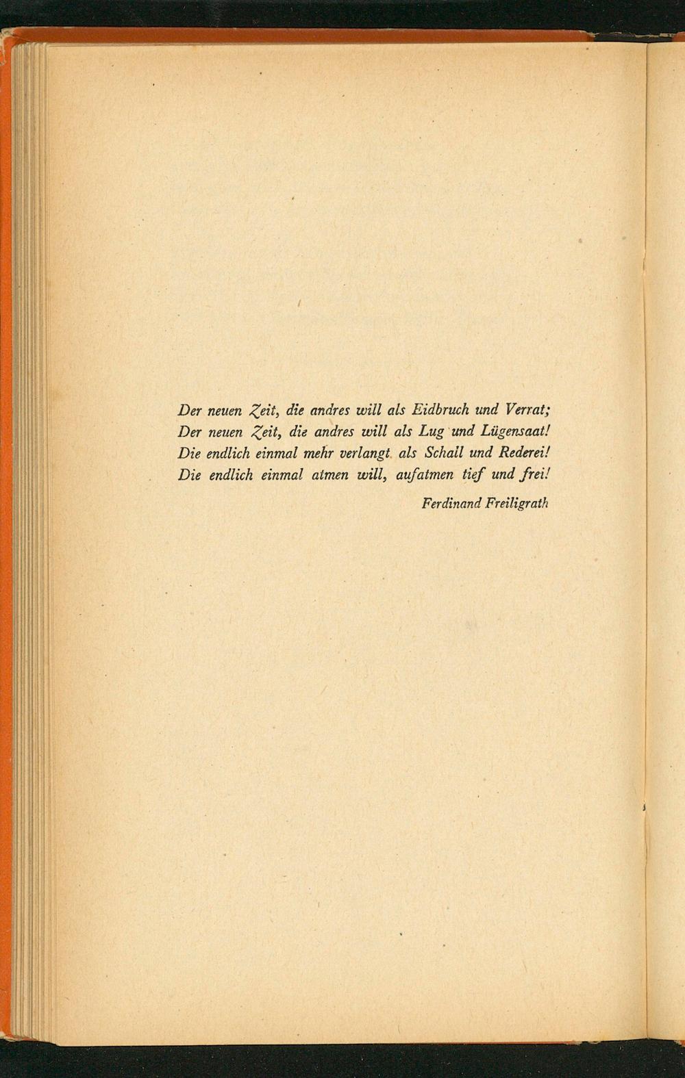 Der neuen Zeit, die andres will als Eidbruch und Verrat; Der neuen Zeit, die andres will als Lug und Lügensaat! Die endlich einmal mehr verlangt als Schall und Rederei! Die endlich einmal atmen will, aufatmen tief und frei! Ferdinand Freiligrath