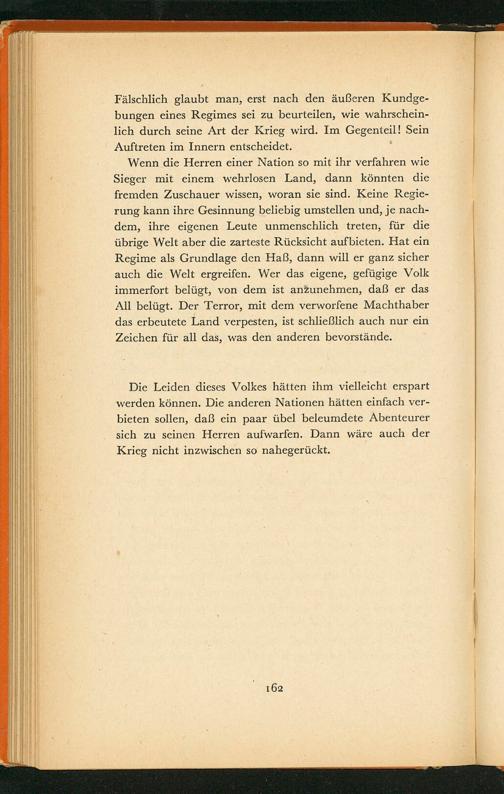 Wenn die Herren einer Nation so mit ihr verfahren wie Sieger mit einem wehrlosen Land, dann könnten die fremden Zuschauer wissen, woran sie sind. Keine Regierung kann ihre Gesinnung beliebig umstellen und, je nachdem, ihre eigenen Leute unmenschlich treten, für die übrige Welt aber die zarteste Rücksicht aufbieten. Hat ein Regime als Grundlage den Haß, dann will er ganz sicher auch die Welt ergreifen. Wer das eigene, gefügige Volk immerfort belügt, von dem ist anzunehmen, daß er das All belügt. Der Terror, mit dem verworfene Machthaber das erbeutete Land verpesten, ist schließlich auch nur ein Zeichen für all das, was den anderen bevorstände.