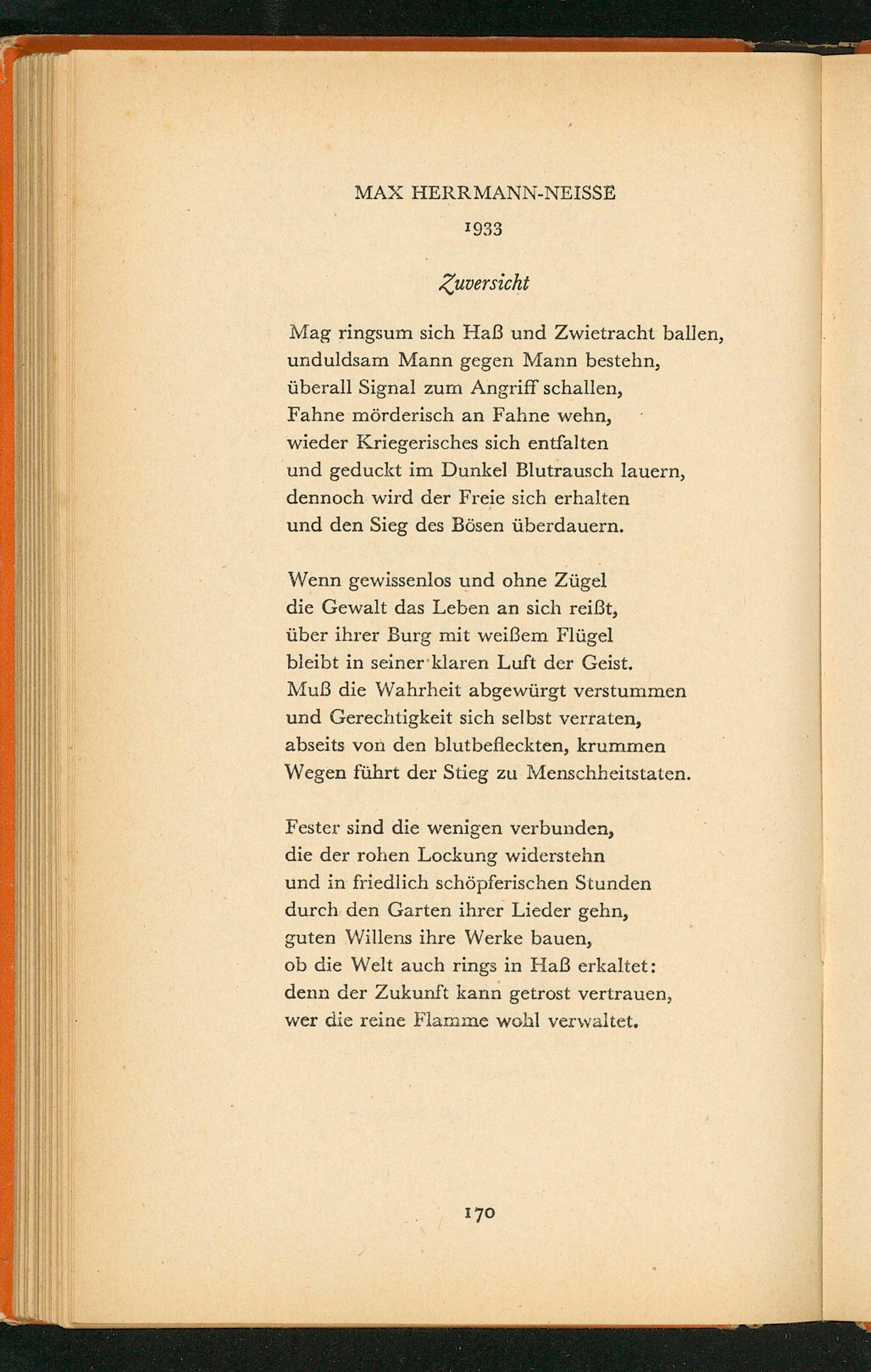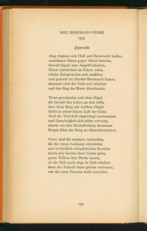 Fester sind die wenigen verbunden, die der rohen Lockung widerstehn und in friedlich schöpferischen Stunden durch den Garten ihrer Lieder gehn, guten Willens ihre Werke bauen, ob die Welt auch rings in Haß erkaltet: denn der Zukunft kann getrost vertrauen, wer die reine Flamme wohl verwaltet.