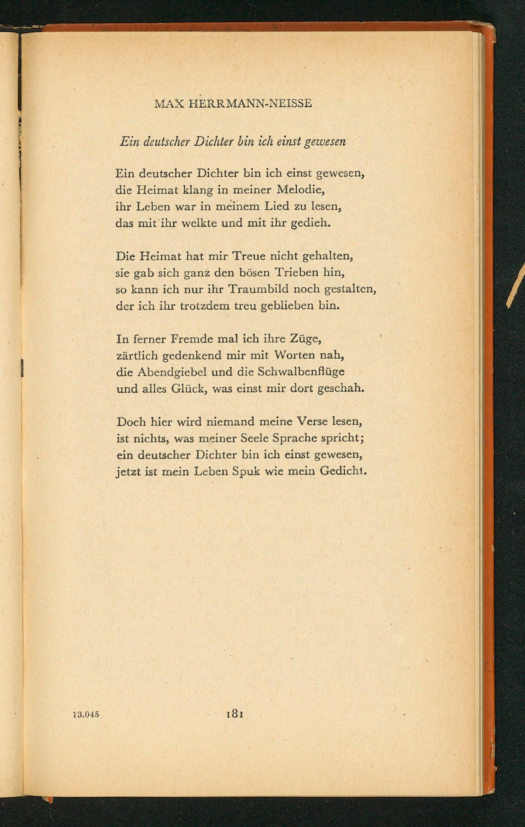 ist nichts, was meiner Seele Sprache spricht; ein deutscher Dichter bin ich einst gewesen, jetzt ist mein Leben Spuk wie mein Gedicht.