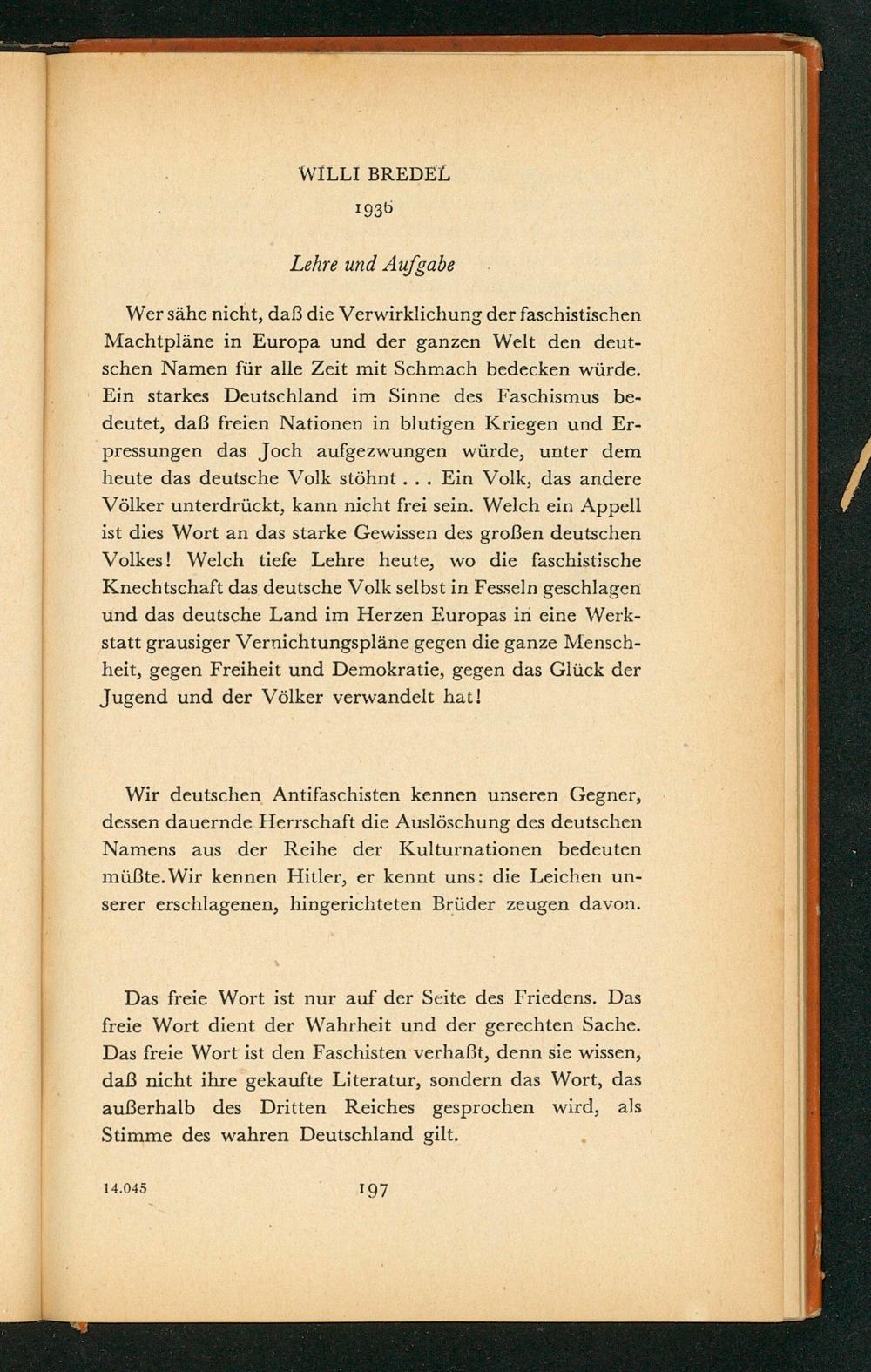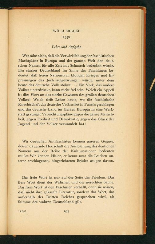 Das freie Wort ist nur auf der Seite des Friedens. Das freie Wort dient der Wahrheit und der gerechten Sache. Das freie Wort ist den Faschisten verhaßt, denn sie wissen, daß nicht ihre gekaufte Literatur, sondern das Wort, das außerhalb des Dritten Reiches gesprochen wird, als Stimme des wahren Deutschland gilt.