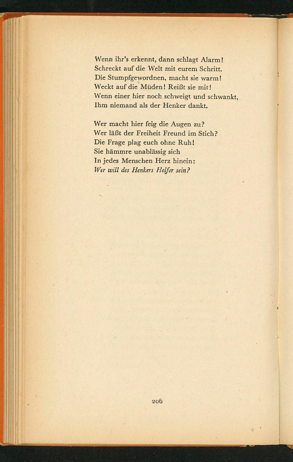 Wer macht hier feig die Augen zu? Wer läßt der Freiheit Freund im Stich? Die Frage plag euch ohne Ruh! Sie hämmre unablässig sich In jedes Menschen Herz hinein: Wer will des Henkers Helfer sein?
