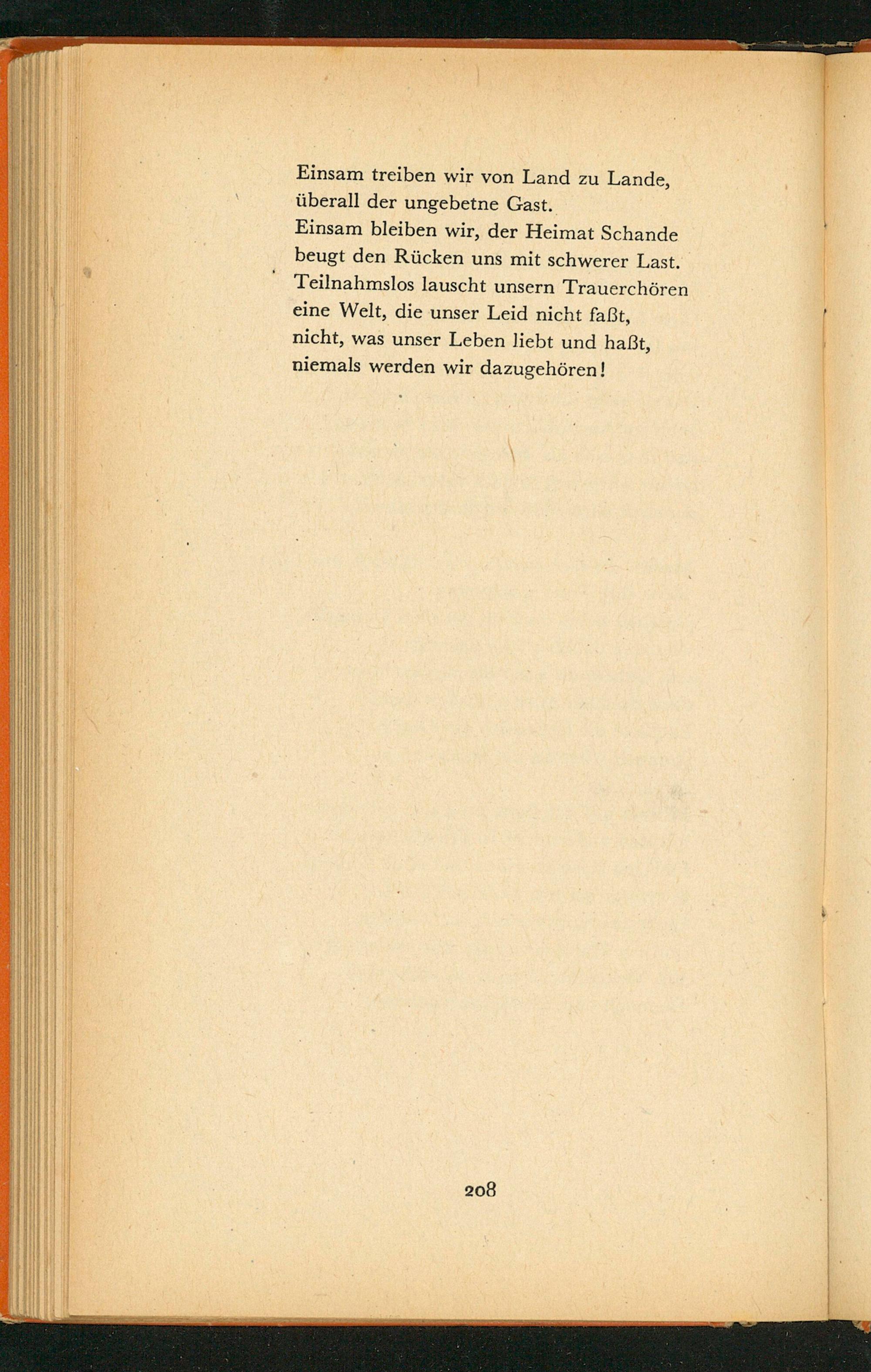 Einsam bleiben wir, der Heimat Schande beugt den Rücken uns mit schwerer Last. Teilnahmslos lauscht unsern Trauerchören eine Welt, die unser Leid nicht faßt, nicht, was unser Leben liebt und haßt, niemals werden wir dazugehören!