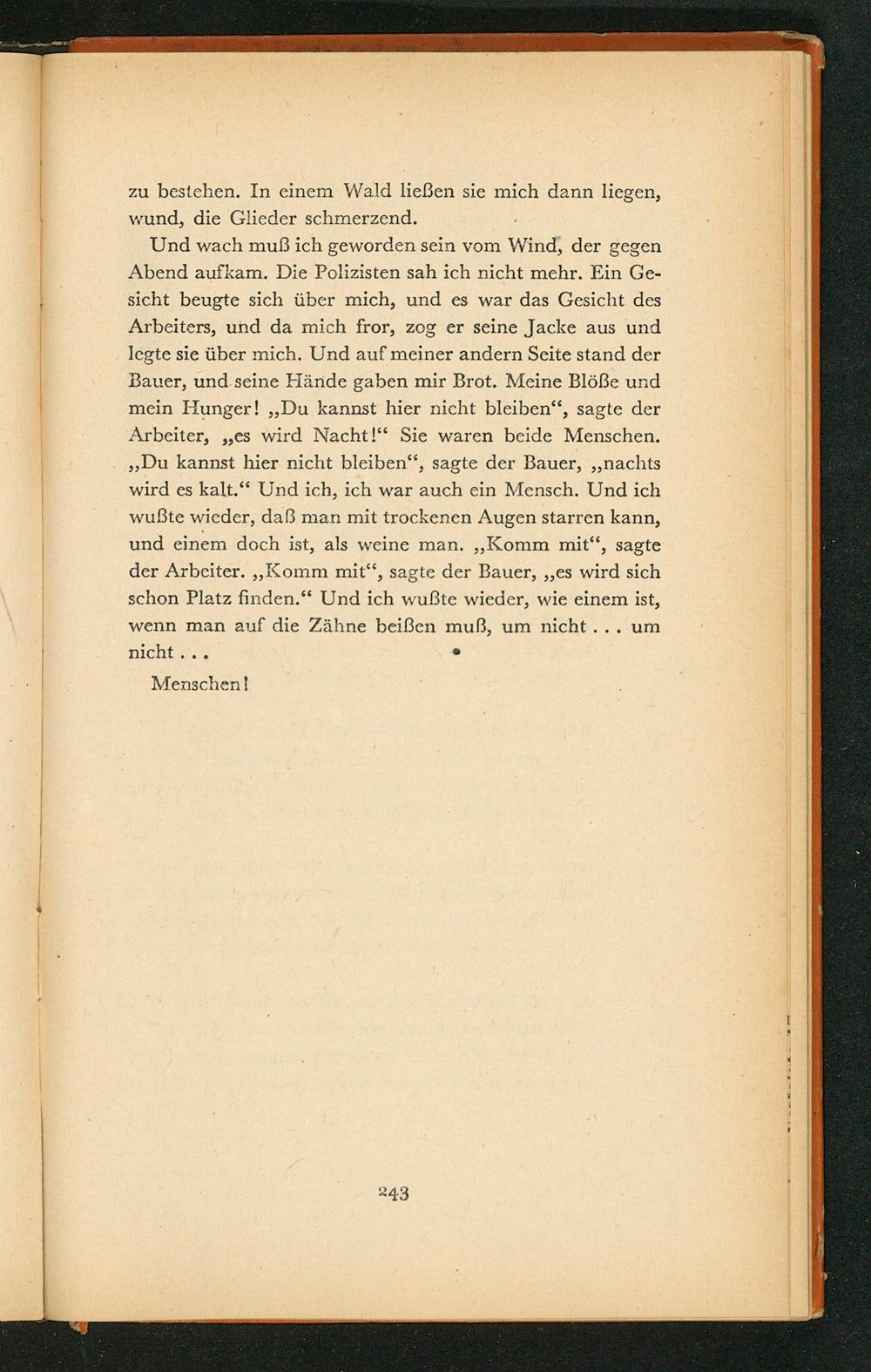 Und wach muß ich geworden sein vom Wind, der gegen Abend aufkam. Die Polizisten sah ich nicht mehr. Ein Gesicht beugte sich über mich, und es war das Gesicht des Arbeiters, und da mich fror, zog er seine Jacke aus und legte sie über mich. Und auf meiner andern Seite stand der Bauer, und seine Hände gaben mir Brot. Meine Blöße und mein Hunger! ,, Du kannst hier nicht bleiben“, sagte der Arbeiter ,,, es wird Nacht!" Sie waren beide Menschen. ,, Du kannst hier nicht bleiben", sagte der Bauer ,,, nachts wird es kalt." Und ich, ich war auch ein Mensch. Und ich wußte wieder, daß man mit trockenen Augen starren kann, und einem doch ist, als weine man. ,, Komm mit", sagte der Arbeiter. ,, Komm mit", sagte der Bauer ,,, es wird sich schon Platz finden." Und ich wußte wieder, wie einem ist, wenn man auf die Zähne beißen muß, um nicht... um nicht...