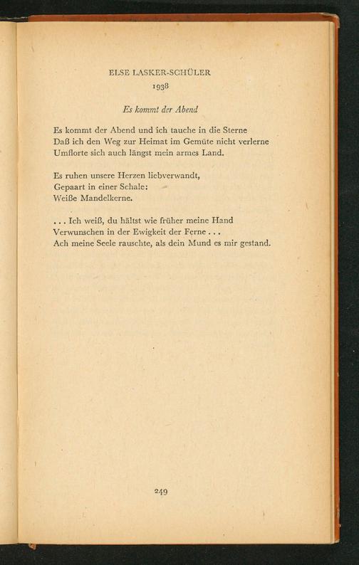 Es kommt der Abend und ich tauche in die Sterne Daß ich den Weg zur Heimat im Gemüte nicht verlerne Umflorte sich auch längst mein armes Land.