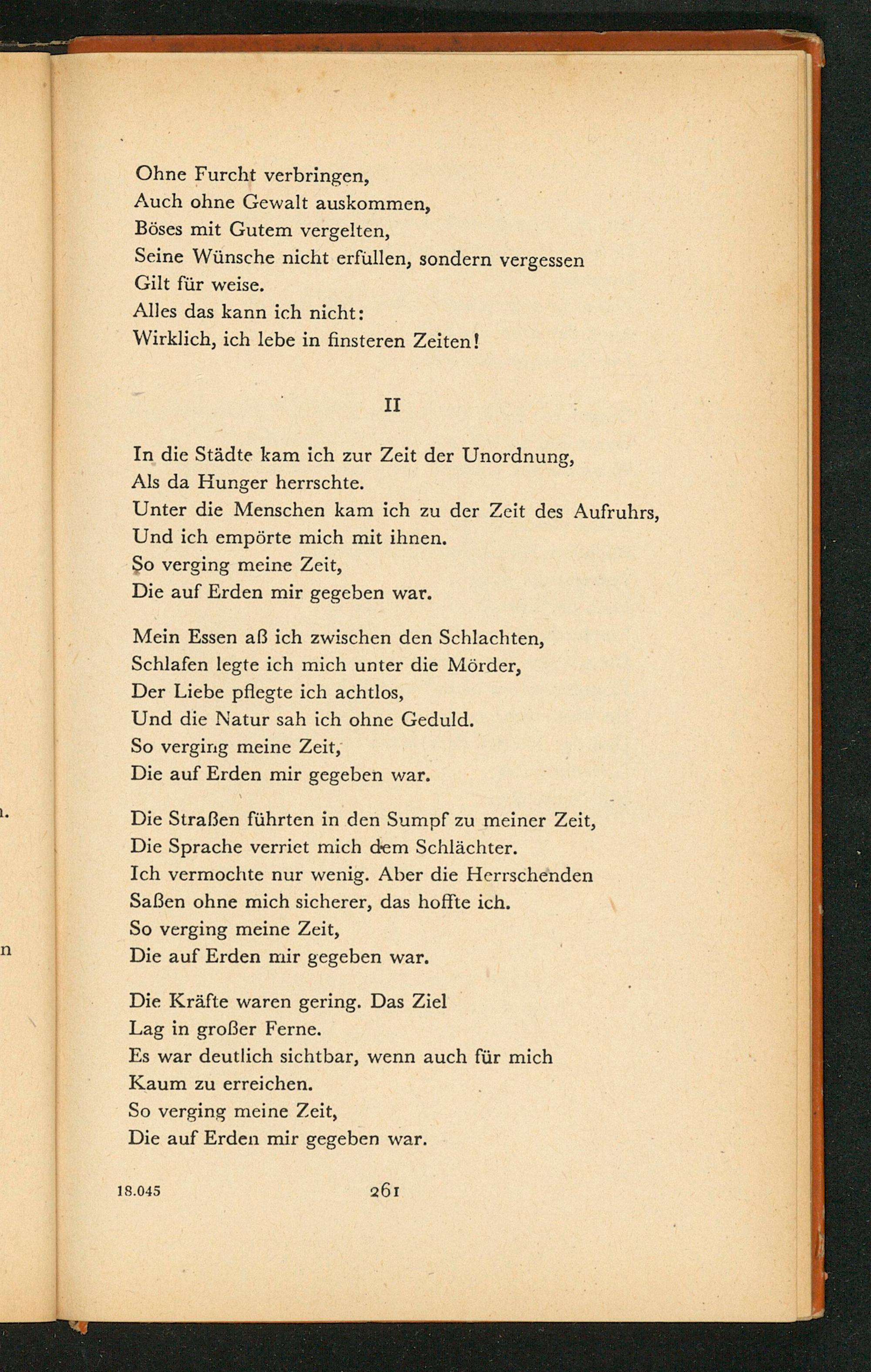 Mein Essen aß ich zwischen den Schlachten, Schlafen legte ich mich unter die Mörder, Der Liebe pflegte ich achtlos,