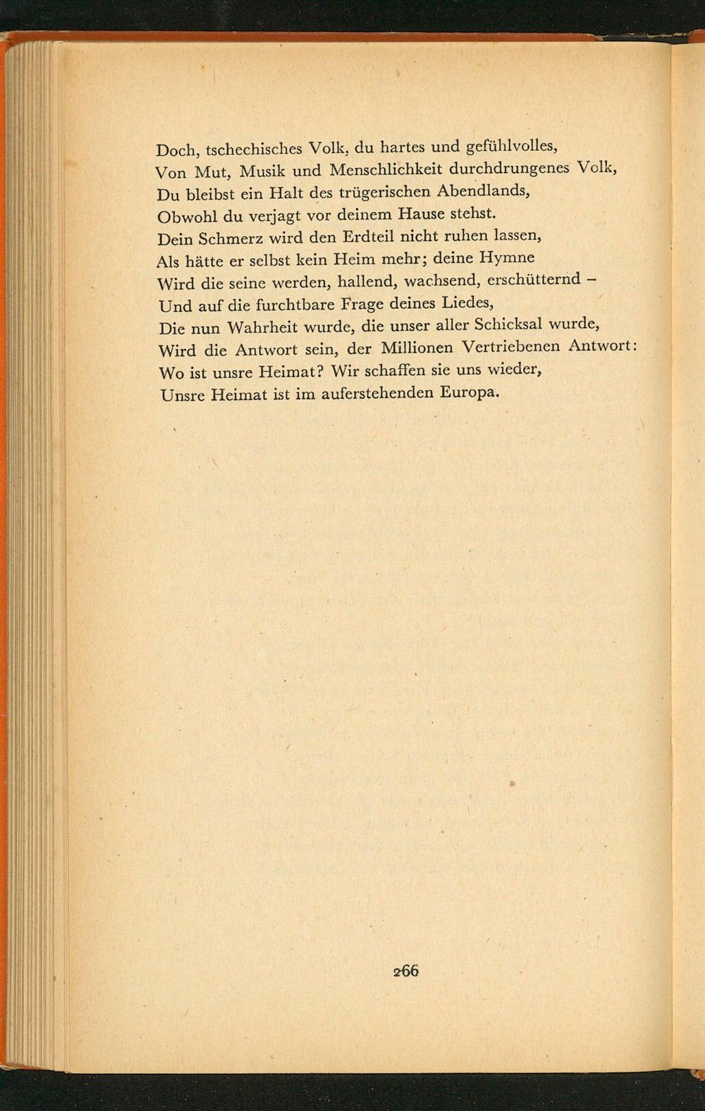 Von Mut, Musik und Menschlichkeit durchdrungenes Volk, Du bleibst ein Halt des trügerischen Abendlands, Obwohl du verjagt vor deinem Hause stehst.