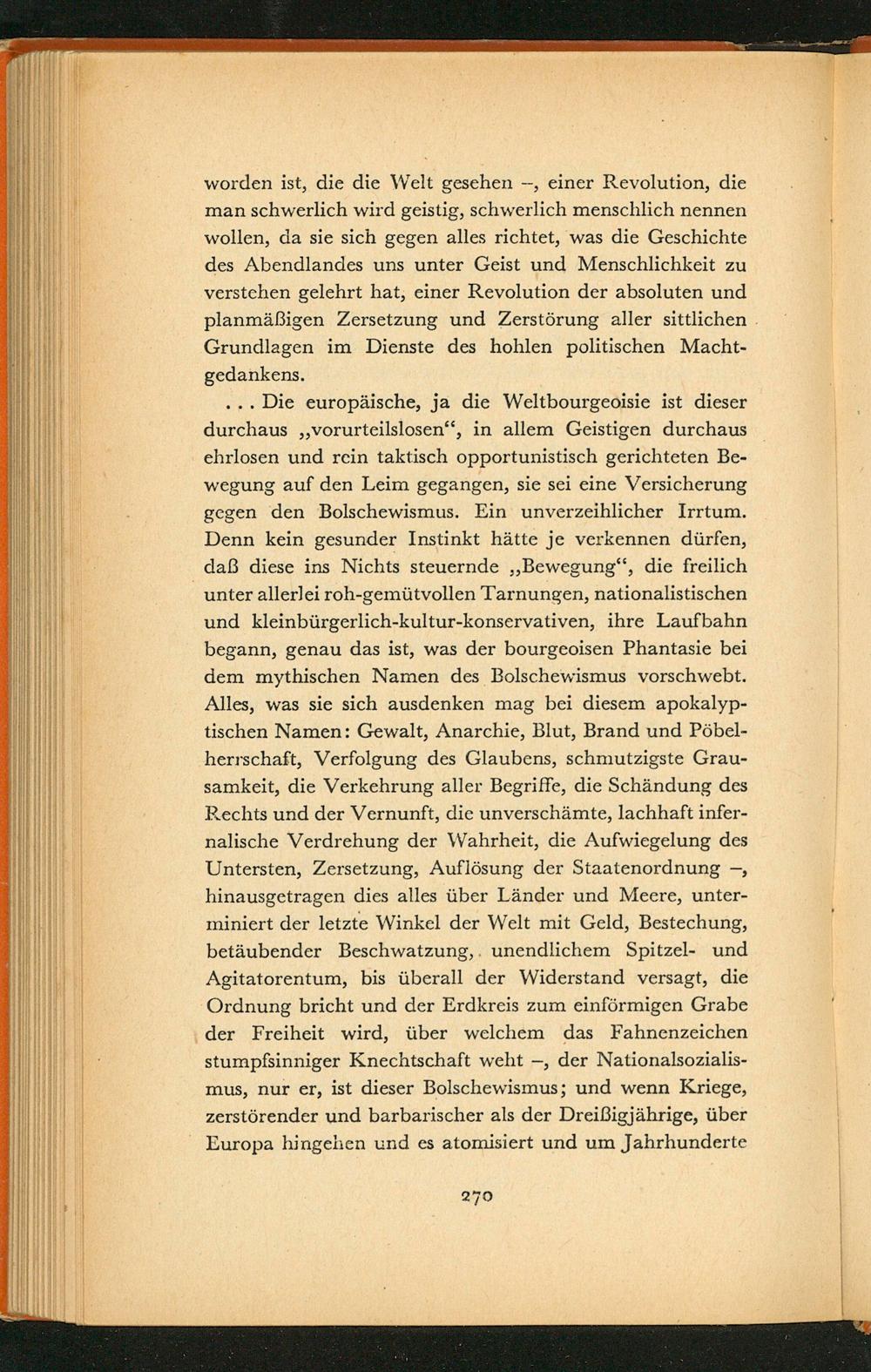 ... Die europäische, ja die Weltbourgeoisie ist dieser durchaus ,, vorurteilslosen", in allem Geistigen durchaus ehrlosen und rein taktisch opportunistisch gerichteten Bewegung auf den Leim gegangen, sie sei eine Versicherung gegen den Bolschewismus. Ein unverzeihlicher Irrtum. Denn kein gesunder Instinkt hätte je verkennen dürfen, daß diese ins Nichts steuernde ,, Bewegung", die freilich unter allerlei roh- gemütvollen Tarnungen, nationalistischen und kleinbürgerlich- kultur- konservativen, ihre Laufbahn. begann, genau das ist, was der bourgeoisen Phantasie bei dem mythischen Namen des Bolschewismus vorschwebt. Alles, was sie sich ausdenken mag bei diesem apokalyptischen Namen: Gewalt, Anarchie, Blut, Brand und Pöbelherrschaft, Verfolgung des Glaubens, schmutzigste Grausamkeit, die Verkehrung aller Begriffe, die Schändung des Rechts und der Vernunft, die unverschämte, lachhaft infernalische Verdrehung der Wahrheit, die Aufwiegelung des Untersten, Zersetzung, Auflösung der Staatenordnung-, hinausgetragen dies alles über Länder und Meere, unterminiert der letzte Winkel der Welt mit Geld, Bestechung, betäubender Beschwatzung, unendlichem Spitzel- und Agitatorentum, bis überall der Widerstand versagt, die Ordnung bricht und der Erdkreis zum einförmigen Grabe der Freiheit wird, über welchem das Fahnenzeichen stumpfsinniger Knechtschaft weht der Nationalsozialismus, nur er, ist dieser Bolschewismus; und wenn Kriege, zerstörender und barbarischer als der Dreißigjährige, über Europa hingehen und es atomisiert und um Jahrhunderte
