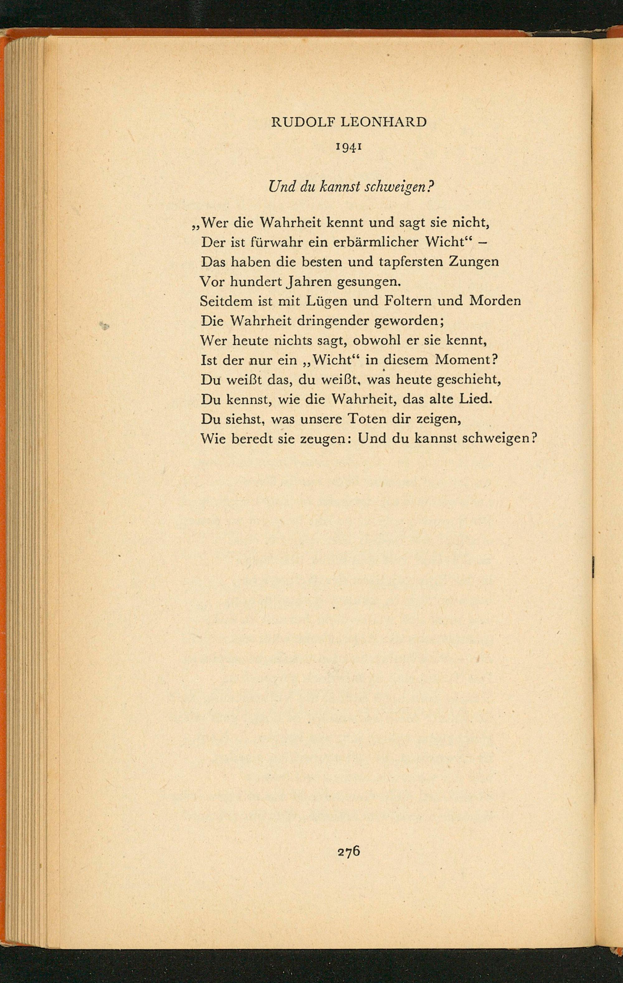 „Wer die Wahrheit kennt und sagt sie nicht, Der ist fürwahr ein erbärmlicher Wicht“— Das haben die besten und tapfersten Zungen Vor hundert Jahren gesungen. Seitdem ist mit Lügen und Foltern und Morden Die Wahrheit dringender geworden; Wer heute nichts sagt, obwohl er sie kennt, Ist der nur ein ‚‚Wicht‘ in diesem Moment? Du weißt das, du weißt, was heute geschieht, Du kennst, wie die Wahrheit, das alte Lied. Du siehst, was unsere Toten dir zeigen, Wie beredt sie zeugen: Und du kannst schweigen?