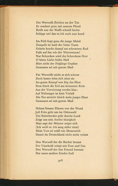 Den Werwolf der die Bücher brennt Der Unschuld würgt mit Feur und Gas Den Werwolf der den Freund berennt Der unsre sanften Kinder fraß