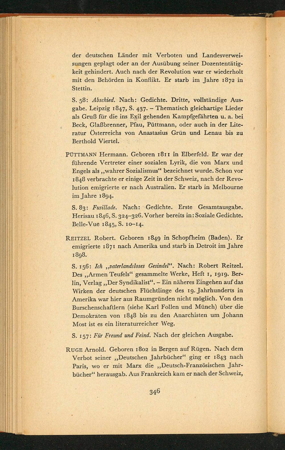 PUTTMANN Hermann. Geboren 1811 in Elberfeld . Er war der führende Vertreter einer sozialen Lyrik, die von Marx und Engels als ,, wahrer Sozialismus" bezeichnet wurde. Schon vor 1848 verbrachte er einige Zeit in der Schweiz , nach der Revolution emigrierte er nach Australien. Er starb in Melbourne im Jahre 1894.