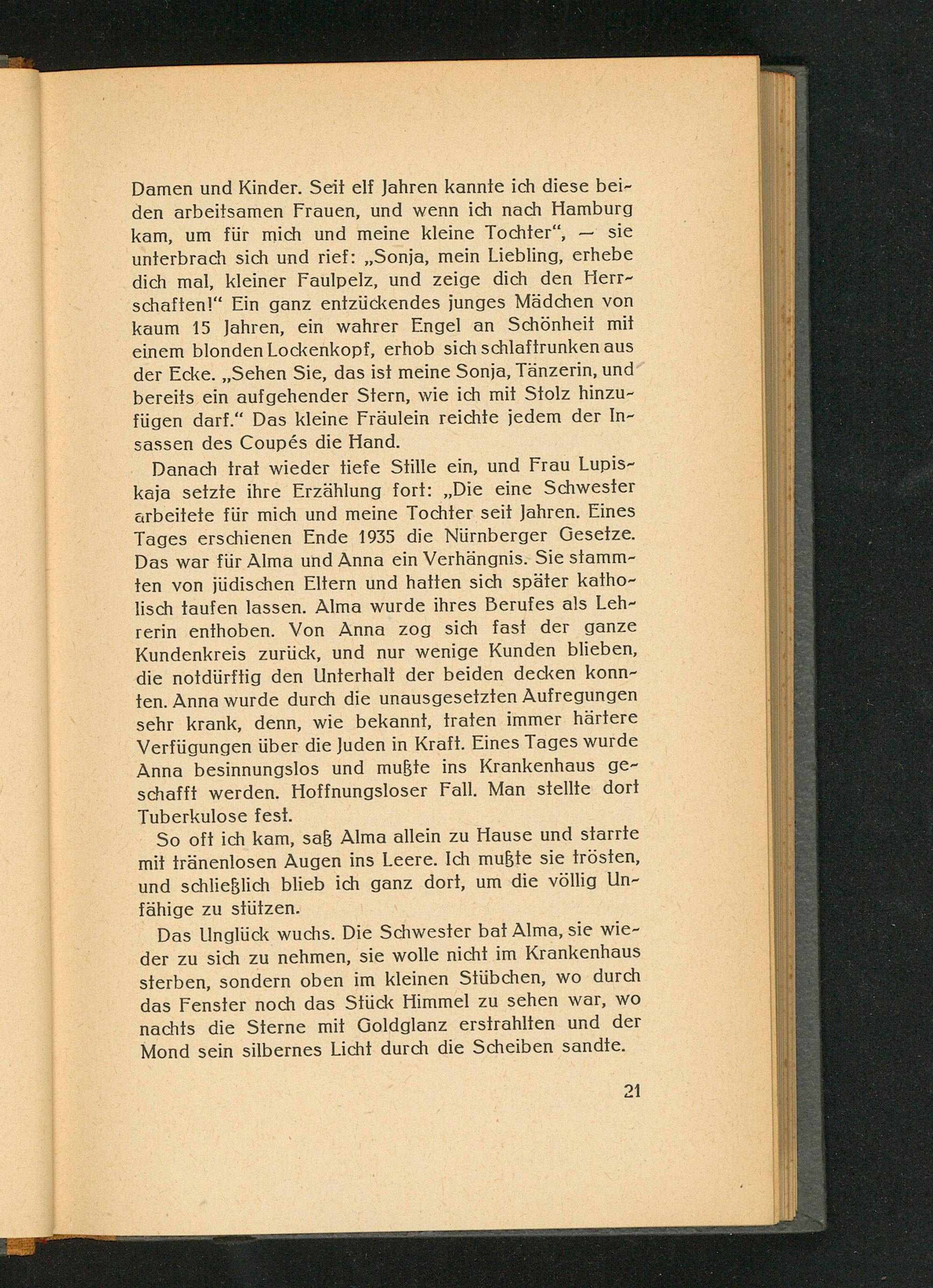 Danach trał wieder tiefe Stille ein, und Frau Lupiskaja setzte ihre Erzählung fort:„ Die eine Schwester arbeitete für mich und meine Tochter seit Jahren. Eines Tages erschienen Ende 1935 die Nürnberger Gesetze . Das war für Alma und Anna ein Verhängnis. Sie stammten von jüdischen Eltern und hatten sich später katholisch taufen lassen. Alma wurde ihres Berufes als Lehrerin enthoben. Von Anna zog sich fast der ganze Kundenkreis zurück, und nur wenige Kunden blieben, die notdürftig den Unterhalt der beiden decken konnten. Anna wurde durch die unausgesetzten Aufregungen sehr krank, denn, wie bekannt, traten immer härtere Verfügungen über die Juden in Kraft. Eines Tages wurde Anna besinnungslos und mußte ins Krankenhaus geschafft werden. Hoffnungsloser Fall. Man stellte dort Tuberkulose fest.