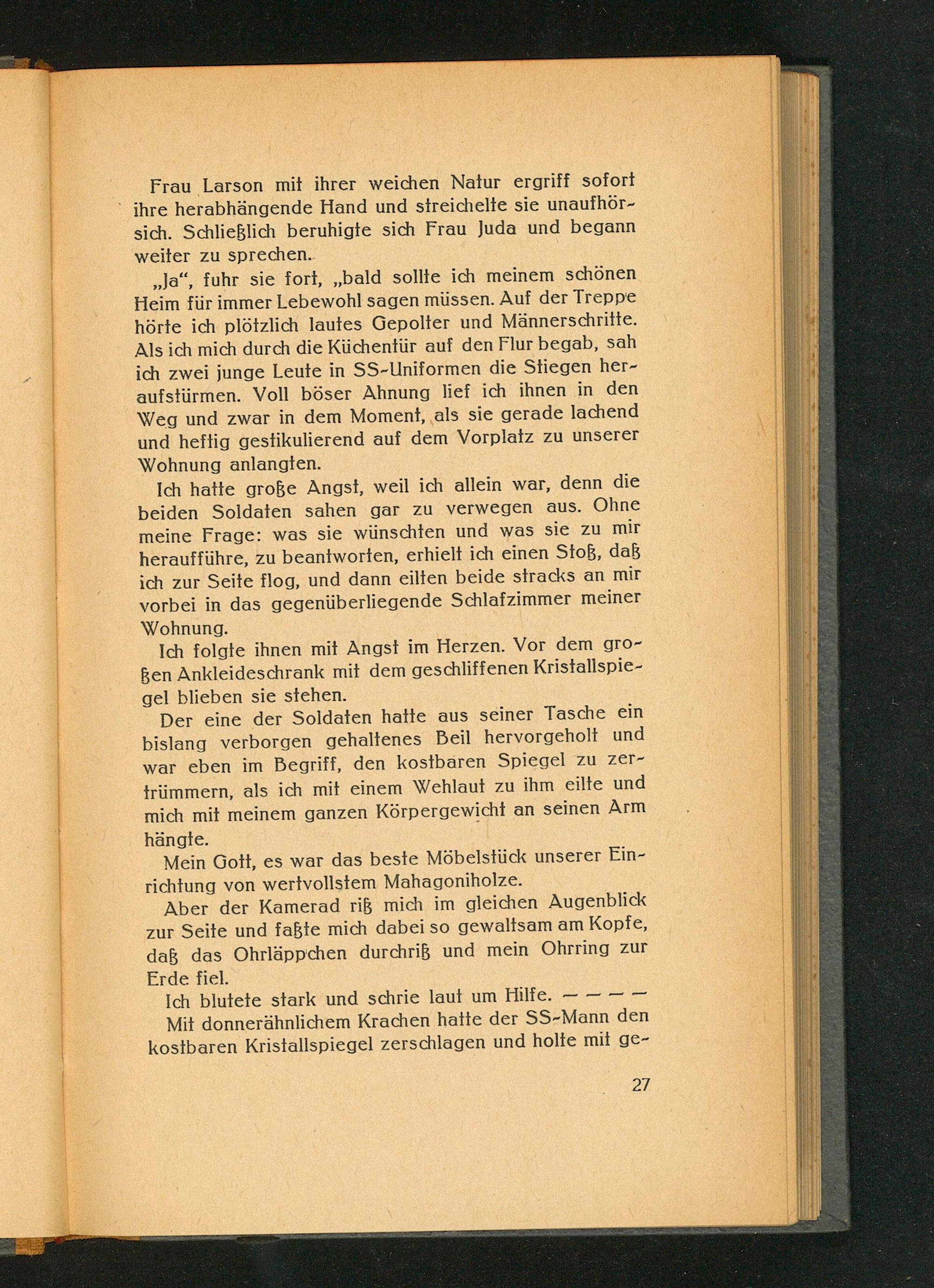 ,, Ja", fuhr sie fort ,,, bald sollte ich meinem schönen Heim für immer Lebewohl sagen müssen. Auf der Treppe hörte ich plötzlich lautes Gepolter und Männerschritte. Als ich mich durch die Küchentür auf den Flur begab, sah ich zwei junge Leute in SS- Uniformen die Stiegen heraufstürmen. Voll böser Ahnung lief ich ihnen in den Weg und zwar in dem Moment, als sie gerade lachend und heftig gestikulierend auf dem Vorplatz zu unserer Wohnung anlangten.