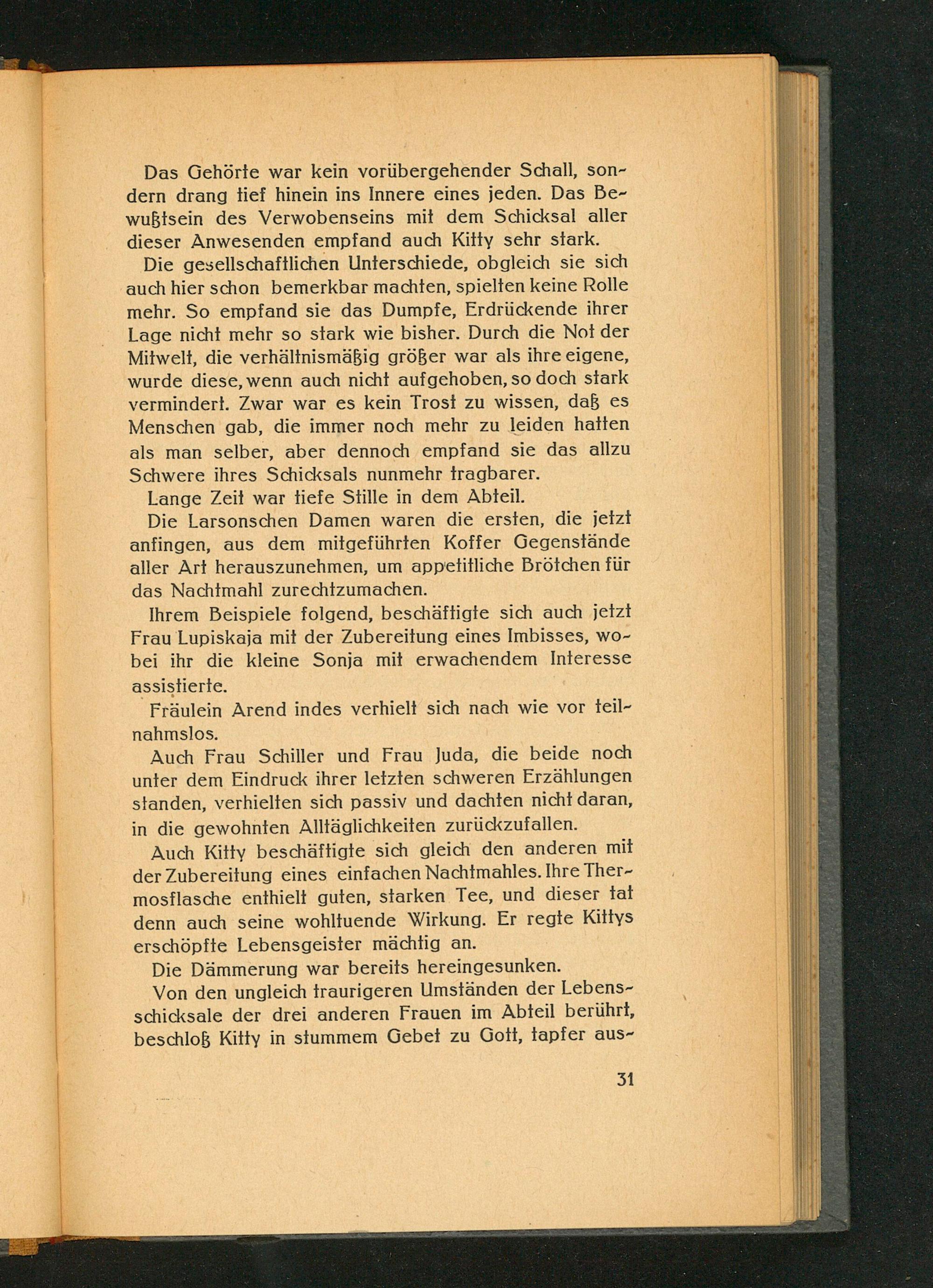 Auch Frau Schiller und Frau Juda, die beide noch unter dem Eindruck ihrer letzten schweren Erzählungen standen, verhielten sich passiv und dachten nicht daran, in die gewohnten Alltäglichkeiten zurückzufallen.