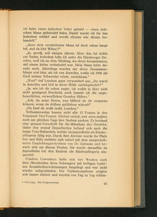 ,, Ja, gewiß, seit einigen Jahren. Aber das tut nichts zur Sache, trotzdem falle ich unter die Nürnberger Gesetze , weil ich an dem Stichtag, wo diese herauskamen, mit einem Juden verheiratet war. Mein Mann lebte damals noch. Allerdings wurden mir diese Zusammenhänge erst klar, als ich von Amerika , wohin ich 1936 als Gast meiner Schwester reiste, zurückkam."