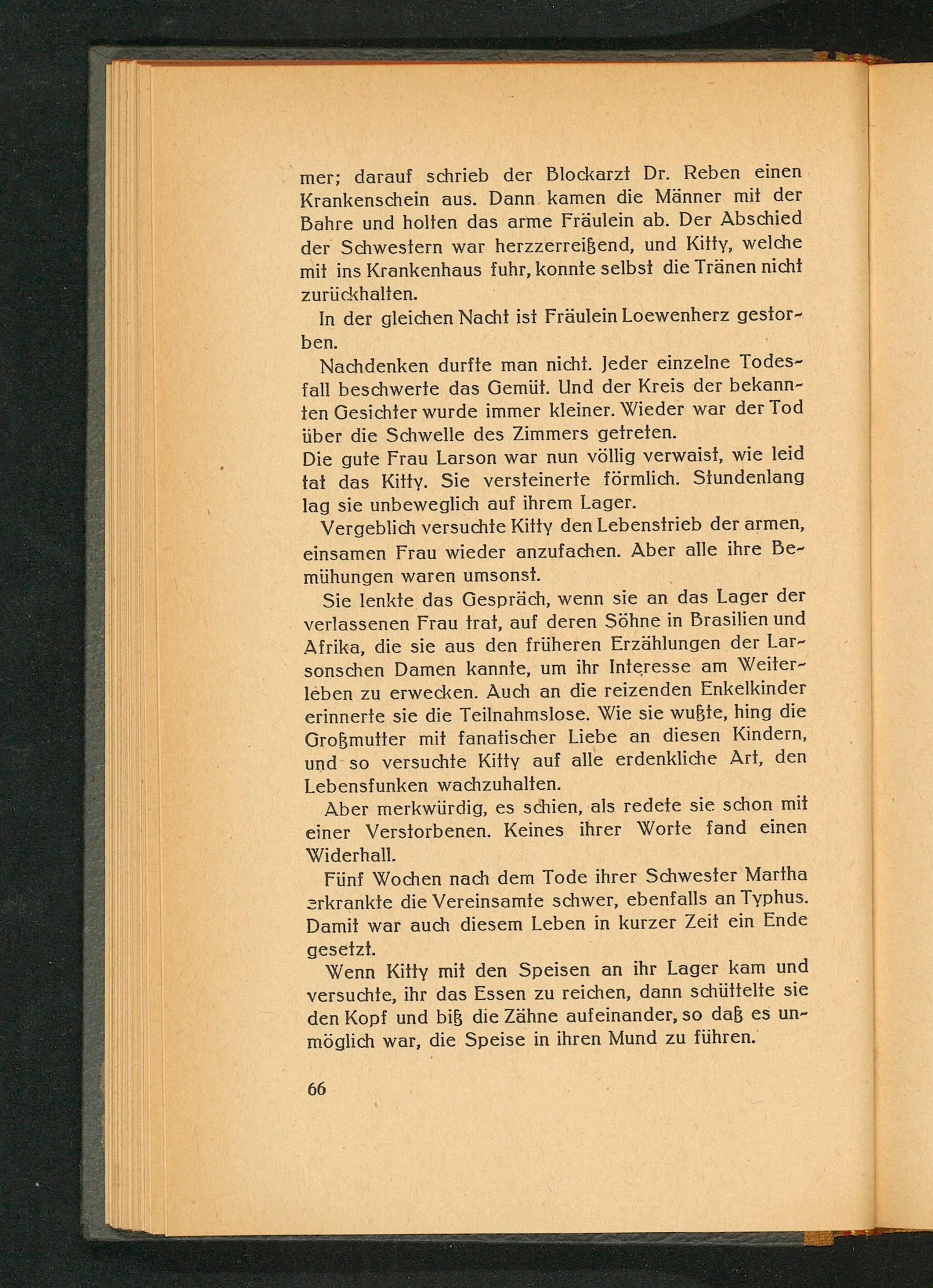 Sie lenkte das Gespräch, wenn sie an das Lager der verlassenen Frau trat, auf deren Söhne in Brasilien und Afrika , die sie aus den früheren Erzählungen der Lar­sonschen Damen kannte, um ihr Interesse am Weiter­leben zu erwecken. Auch an die reizenden Enkelkinder erinnerte sie die Teilnahmslose. Wie sie wußte, hing die Großmutter mit fanatischer Liebe an diesen Kindern, und so versuchte Kitty auf alle erdenkliche Art, den Lebensfunken wachzuhalten.