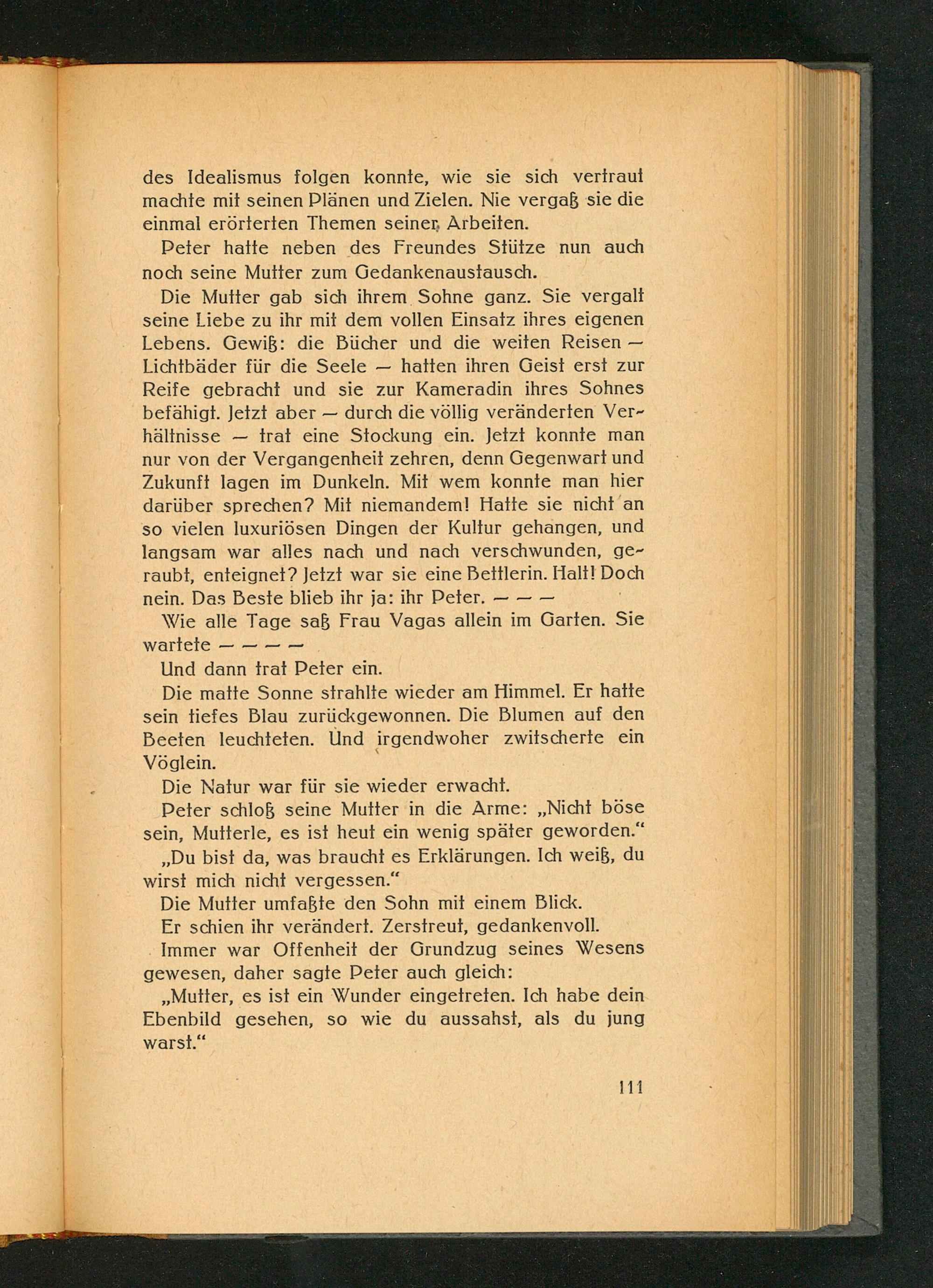 Die Mutter gab sich ihrem Sohne ganz. Sie vergalt seine Liebe zu ihr mit dem vollen Einsatz ihres eigenen Lebens. Gewiß: die Bücher und die weiten Reisen Lichtbäder für die Seele hatten ihren Geist erst zur Reife gebracht und sie zur Kameradin ihres Sohnes befähigt. Jetzt aber durch die völlig veränderten Verhältnisse trat eine Stockung ein. Jetzt konnte man nur von der Vergangenheit zehren, denn Gegenwart und Zukunft lagen im Dunkeln. Mit wem konnte man hier darüber sprechen? Mit niemandem! Hatte sie nicht an so vielen luxuriösen Dingen der Kultur gehangen, und langsam war alles nach und nach verschwunden, geraubt, enteignet? Jetzt war sie eine Bettlerin. Halt! Doch nein. Das Beste blieb ihr ja: ihr Peter.-