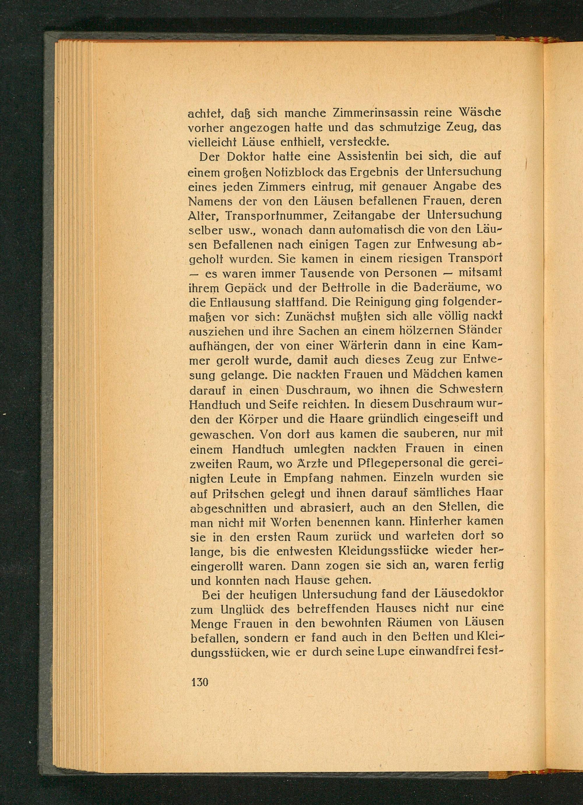 Der Doktor hatte eine Assistentin bei sich, die auf einem großen Notizblock das Ergebnis der Untersuchung eines jeden Zimmers eintrug, mit genauer Angabe des Namens der von den Läusen befallenen Frauen, deren Alter, Transportnummer, Zeitangabe der Untersuchung selber usw., wonach dann automatisch die von den Läusen Befallenen nach einigen Tagen zur Entwesung abgeholt wurden. Sie kamen in einem riesigen Transport mitsamt es waren immer Tausende von Personen ihrem Gepäck und der Bettrolle in die Baderäume, wo die Entlausung stattfand. Die Reinigung ging folgendermaßen vor sich: Zunächst mußten sich alle völlig nackt ausziehen und ihre Sachen an einem hölzernen Ständer aufhängen, der von einer Wärterin dann in eine Kammer gerolt wurde, damit auch dieses Zeug zur Entwesung gelange. Die nackten Frauen und Mädchen kamen darauf in einen Duschraum, wo ihnen die Schwestern Handtuch und Seife reichten. In diesem Duschraum wurden der Körper und die Haare gründlich eingeseift und gewaschen. Von dort aus kamen die sauberen, nur mit einem Handtuch umlegten nackten Frauen in einen zweiten Raum, wo Ärzte und Pflegepersonal die gereinigten Leute in Empfang nahmen. Einzeln wurden sie auf Pritschen gelegt und ihnen darauf sämtliches Haar abgeschnitten und abrasiert, auch an den Stellen, die man nicht mit Worten benennen kann. Hinterher kamen sie in den ersten Raum zurück und warteten dort so lange, bis die entwesten Kleidungsstücke wieder hereingerollt waren. Dann zogen sie sich an, waren fertig und konnten nach Hause gehen.