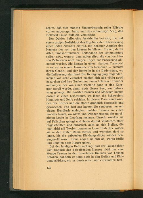 achtet, daß sich manche Zimmerinsassin reine Wäsche vorher angezogen hatte und das schmutzige Zeug, das vielleicht Läuse enthielt, versteckte.