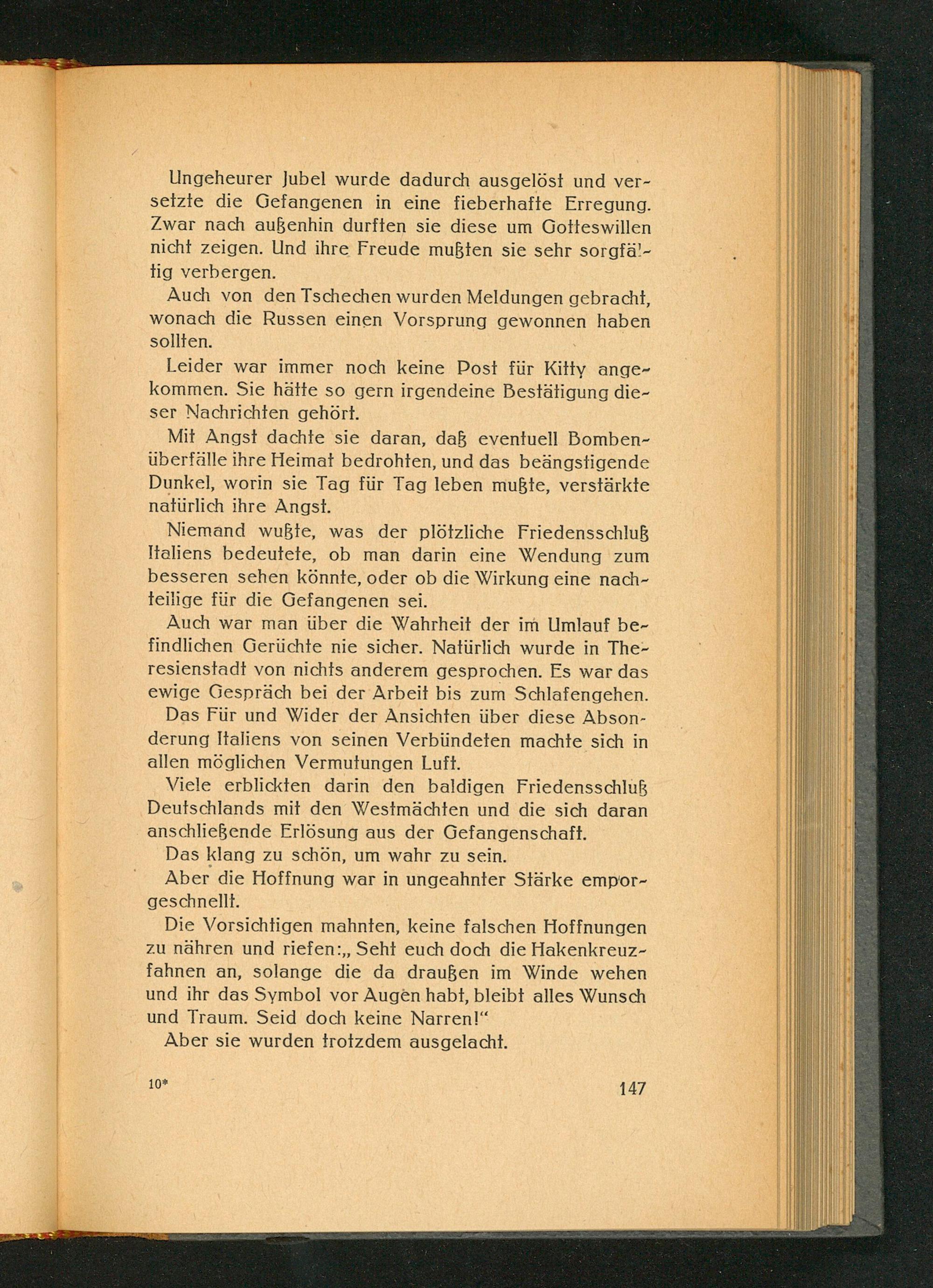 Auch war man über die Wahrheit der im Umlauf befindlichen Gerüchte nie sicher. Natürlich wurde in Theresienstadt von nichts anderem gesprochen. Es war das ewige Gespräch bei der Arbeit bis zum Schlafengehen. Das Für und Wider der Ansichten über diese Absonderung Italiens von seinen Verbündeten machte sich in allen möglichen Vermutungen Luft.
