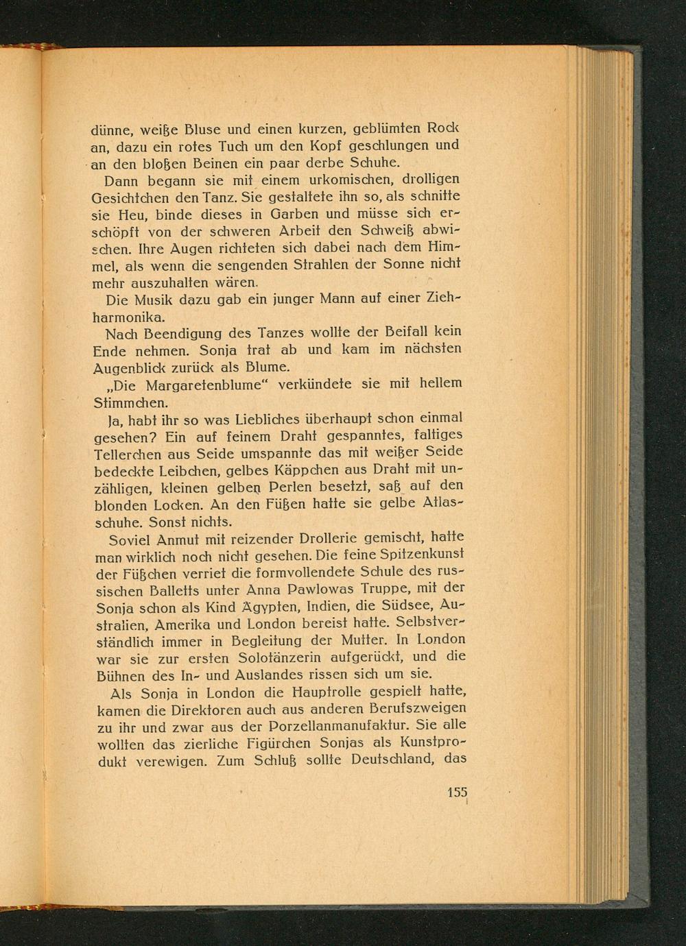 Soviel Anmut mit reizender Drollerie gemischt, hatte man wirklich noch nicht gesehen. Die feine Spitzenkunst der Füßchen verriet die formvollendete Schule des russischen Balletts unter Anna Pawlowas Truppe, mit der Sonja schon als Kind Ägypten, Indien, die Südsee, Australien, Amerika und London bereist hatte. Selbstverständlich immer in Begleitung der Mutter. In London war sie zur ersten Solotänzerin aufgerückt, und die Bühnen des In- und Auslandes rissen sich um sie.