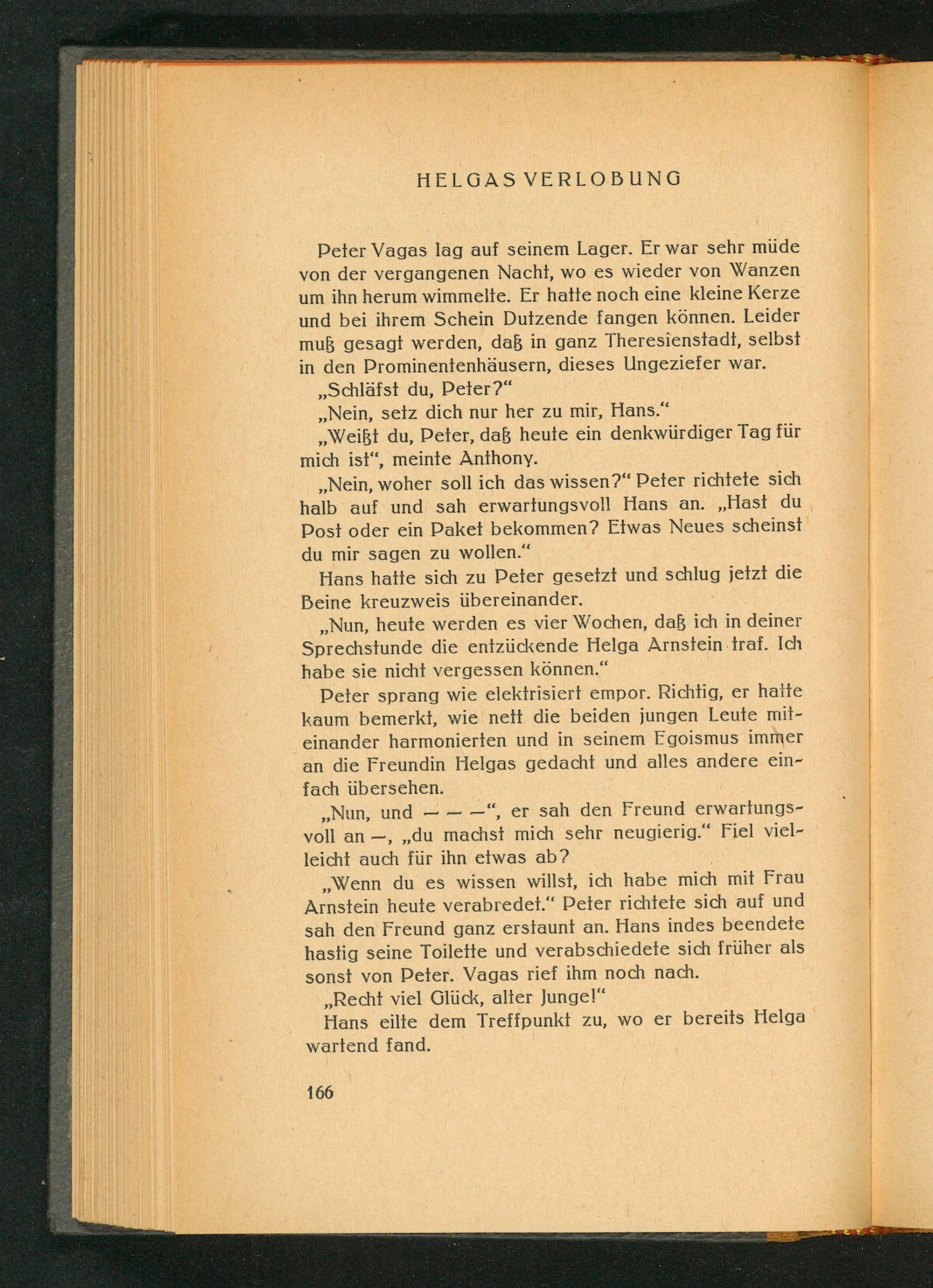 Peter Vagas lag auf seinem Lager. Er war sehr müde von der vergangenen Nacht, wo es wieder von Wanzen um ihn herum wimmelte. Er hatte noch eine kleine Kerze und bei ihrem Schein Dutzende fangen können. Leider muß gesagt werden, daß in ganz Theresienstadt, selbst in den Prominentenhäusern, dieses Ungeziefer war. ,, Schläfst du, Peter?"