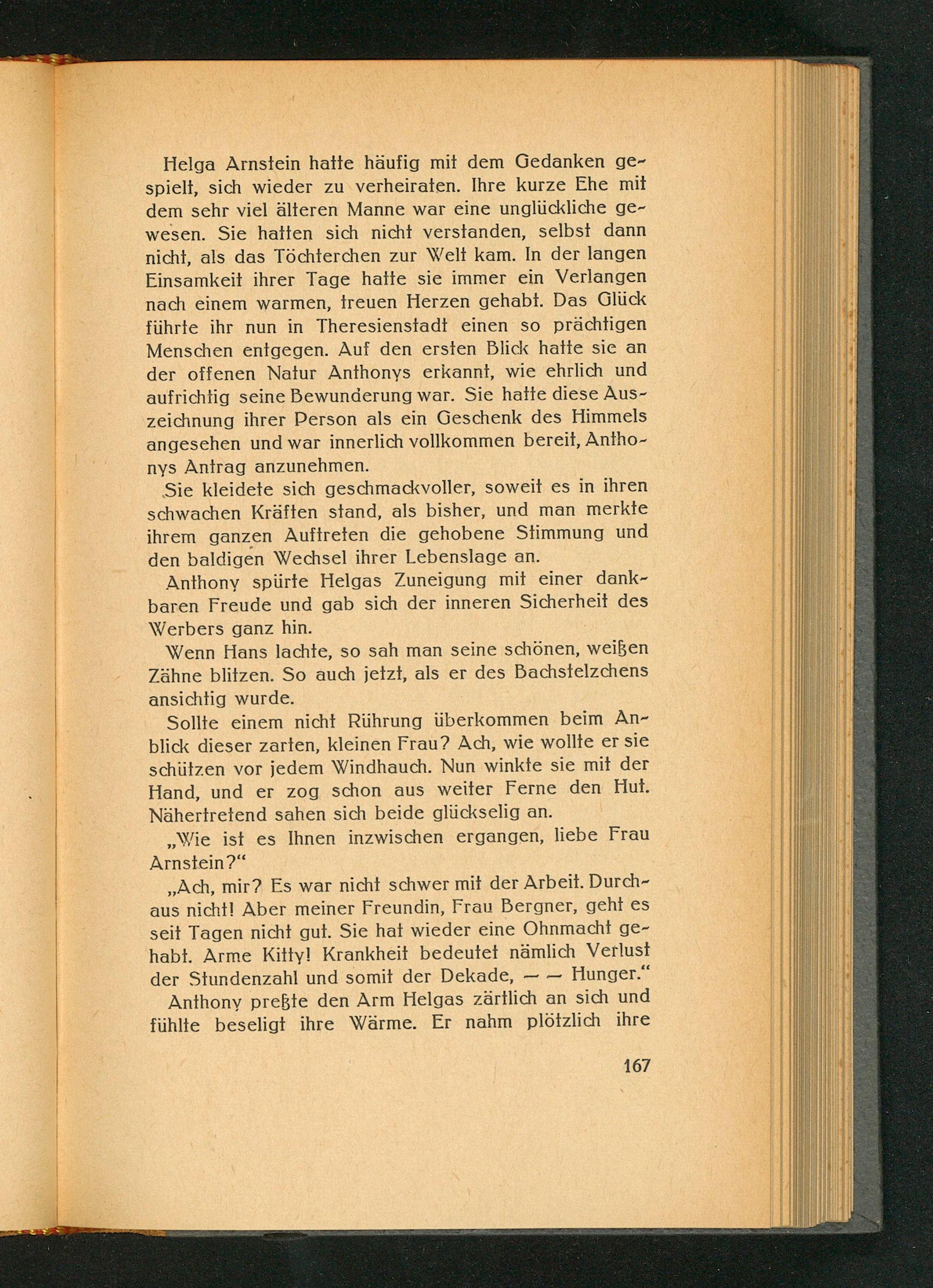 Helga Arnstein hatte häufig mit dem Gedanken gespielt, sich wieder zu verheiraten. Ihre kurze Ehe mit dem sehr viel älteren Manne war eine unglückliche gewesen. Sie hatten sich nicht verstanden, selbst dann nicht, als das Töchterchen zur Welt kam. In der langen Einsamkeit ihrer Tage hatte sie immer ein Verlangen nach einem warmen, freuen Herzen gehabt. Das Glück führte ihr nun in Theresienstadt einen so prächtigen Menschen entgegen. Auf den ersten Blick hatte sie an der offenen Natur Anthonys erkannt, wie ehrlich und aufrichtig seine Bewunderung war. Sie hatte diese Auszeichnung ihrer Person als ein Geschenk des Himmels angesehen und war innerlich vollkommen bereit, Anthonys Antrag anzunehmen.