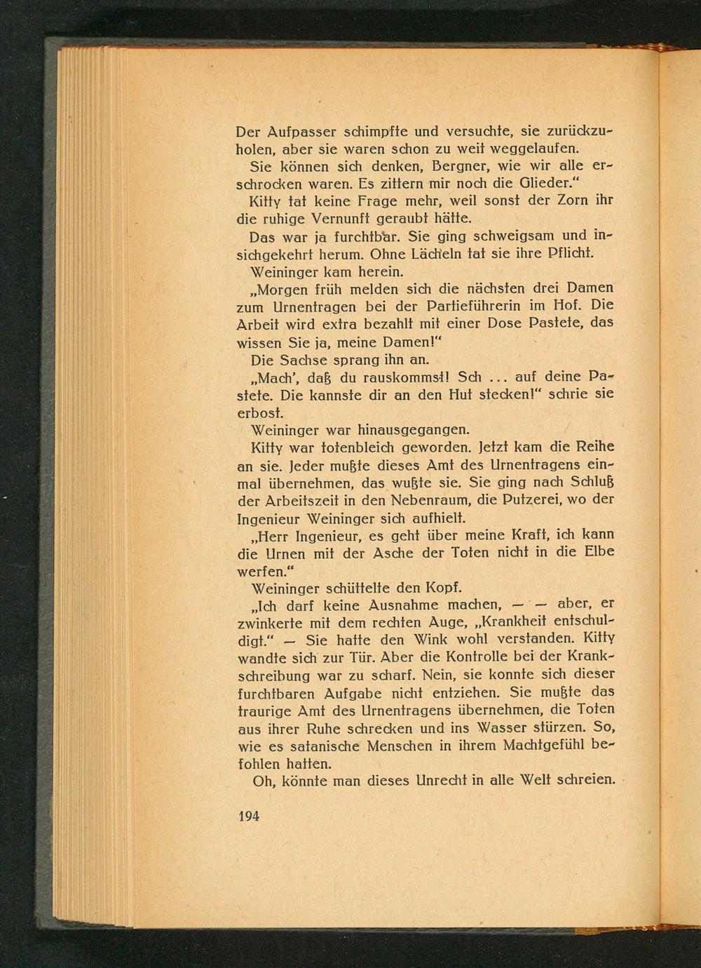 ,, Ich darf keine Ausnahme machen,- aber, er zwinkerte mit dem rechten Auge ,,, Krankheit entschuldigt." Sie hatte den Wink wohl verstanden. Kitty wandte sich zur Tür. Aber die Kontrolle bei der Krankschreibung war zu scharf. Nein, sie konnte sich dieser furchtbaren Aufgabe nicht entziehen. Sie mußte das traurige Amt des Urnentragens übernehmen, die Toten aus ihrer Ruhe schrecken und ins Wasser stürzen. So, wie es satanische Menschen in ihrem Machtgefühl befohlen hatten.