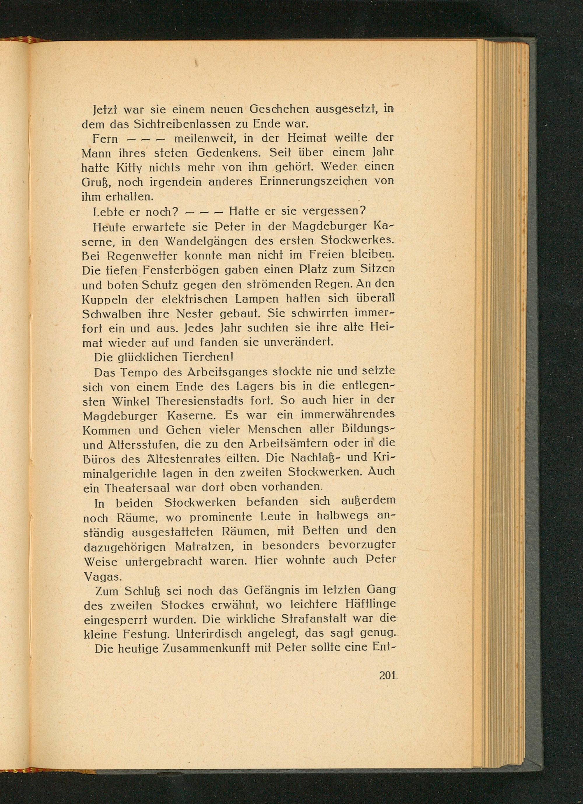 Das Tempo des Arbeitsganges stockte nie und setzte sich von einem Ende des Lagers bis in die entlegensten Winkel Theresienstadts fort. So auch hier in der Magdeburger Kaserne. Es war ein immerwährendes Kommen und Gehen vieler Menschen aller Bildungsund Altersstufen, die zu den Arbeitsämtern oder in die Büros des Altestenrates eilten. Die Nachlaß- und Kriminalgerichte lagen in den zweiten Stockwerken. Auch ein Theatersaal war dort oben vorhanden.