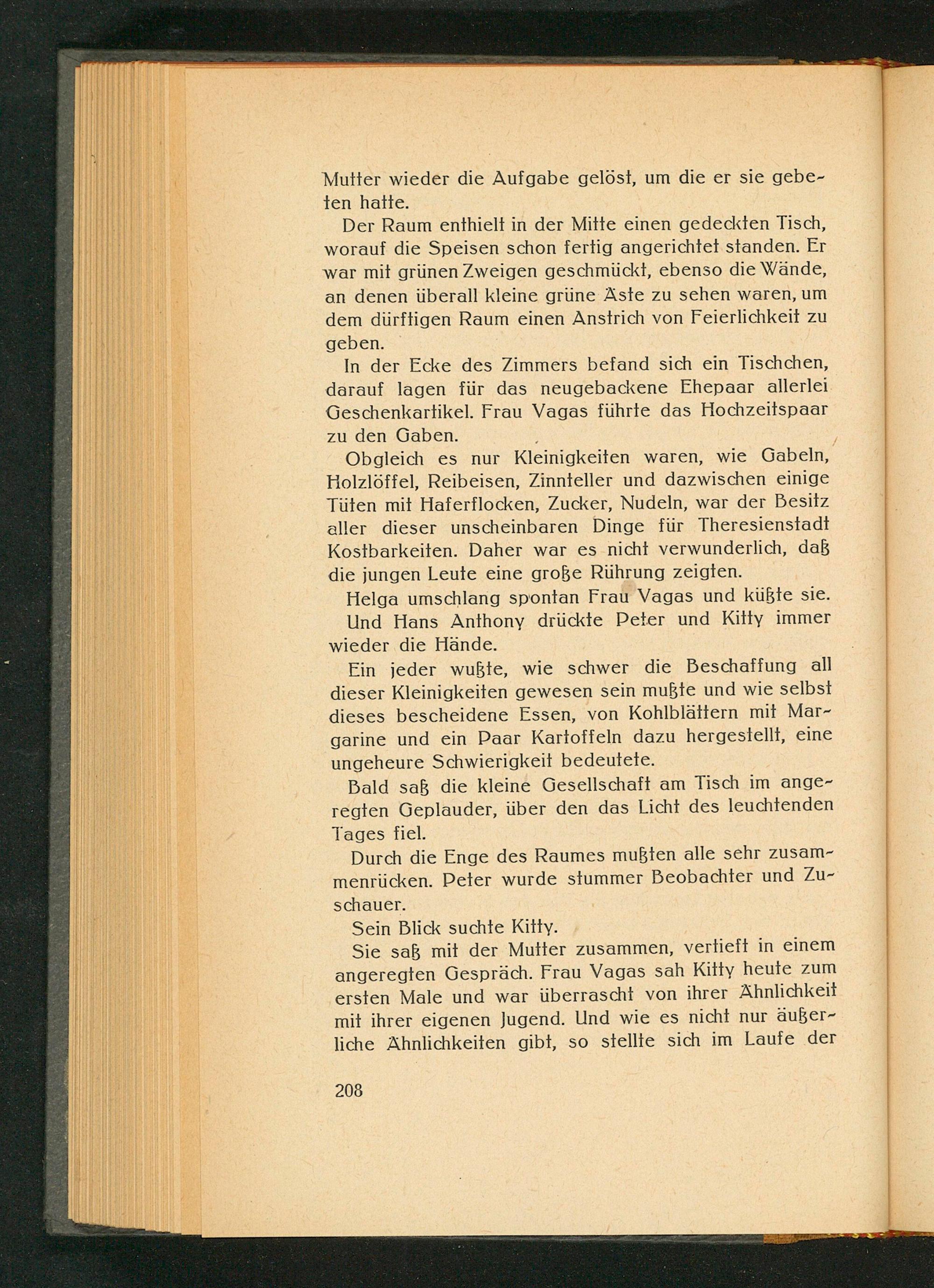 Obgleich es nur Kleinigkeiten waren, wie Gabeln, Holzlöffel, Reibeisen, Zinnteller und dazwischen einige Tüten mit Haferflocken, Zucker, Nudeln, war der Besitz aller dieser unscheinbaren Dinge für Theresienstadt Kostbarkeiten. Daher war es nicht verwunderlich, daß die jungen Leute eine große Rührung zeigten.