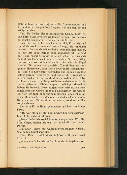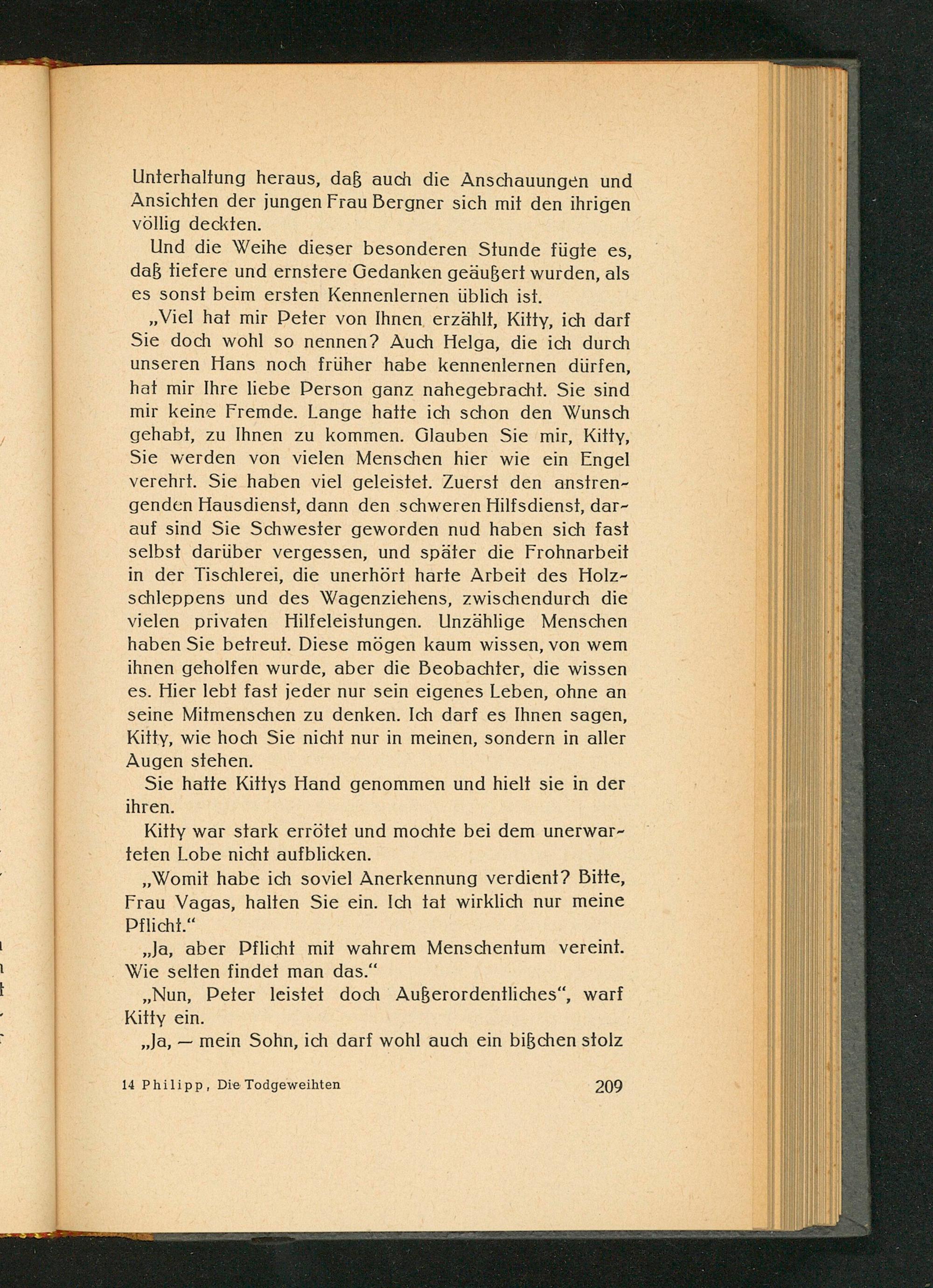 ,, Viel hat mir Peter von Ihnen erzählt, Kitty, ich darf Sie doch wohl so nennen? Auch Helga, die ich durch unseren Hans noch früher habe kennenlernen dürfen, hat mir Ihre liebe Person ganz nahegebracht. Sie sind mir keine Fremde. Lange hatte ich schon den Wunsch gehabt, zu Ihnen zu kommen. Glauben Sie mir, Kitty, Sie werden von vielen Menschen hier wie ein Engel verehrt. Sie haben viel geleistet. Zuerst den anstrengenden Hausdienst, dann den schweren Hilfsdienst, darauf sind Sie Schwester geworden nud haben sich fast selbst darüber vergessen, und später die Frohnarbeit in der Tischlerei, die unerhört harte Arbeit des Holzschleppens und des Wagenziehens, zwischendurch die vielen privaten Hilfeleistungen. Unzählige Menschen haben Sie betreut. Diese mögen kaum wissen, von wem ihnen geholfen wurde, aber die Beobachter, die wissen es. Hier lebt fast jeder nur sein eigenes Leben, ohne an seine Mitmenschen zu denken. Ich darf es Ihnen sagen, Kitty, wie hoch Sie nicht nur in meinen, sondern in aller Augen stehen.