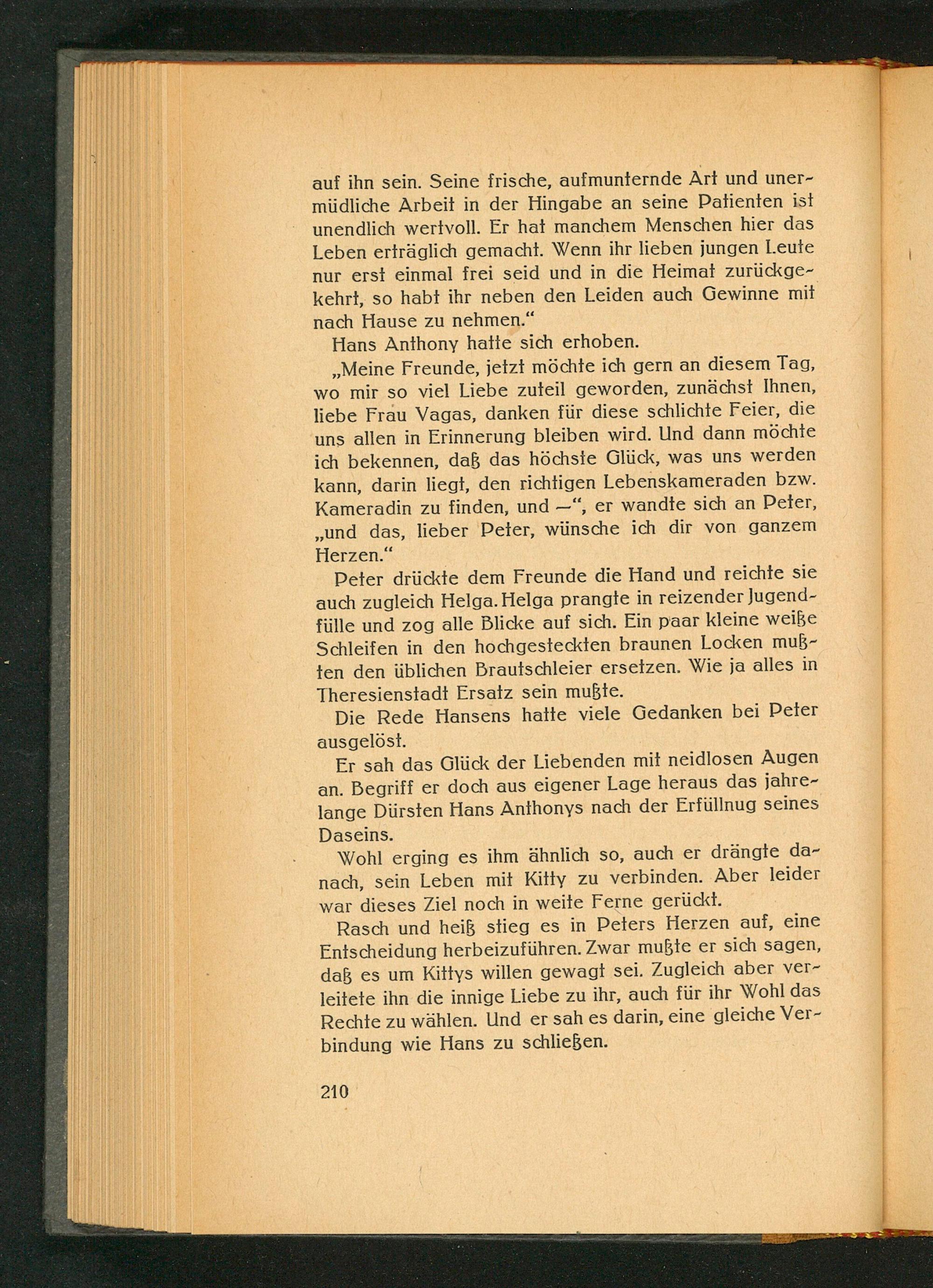 „Meine Freunde, jetzt möchte ich gern an diesem Tag, wo mir so viel Liebe zuteil geworden, zunächst Ihnen, liebe Frau Vagas, danken für diese schlichte Feier, die uns allen in Erinnerung bleiben wird. Und dann möchte ich bekennen, daß das höchste Glück, was uns werden kann, darin liegt, den richtigen Lebenskameraden bzw. Kameradin zu finden, und—“, er wandte sich an Peter, „und das, lieber Peter, wünsche ich dir von ganzem Herzen.“