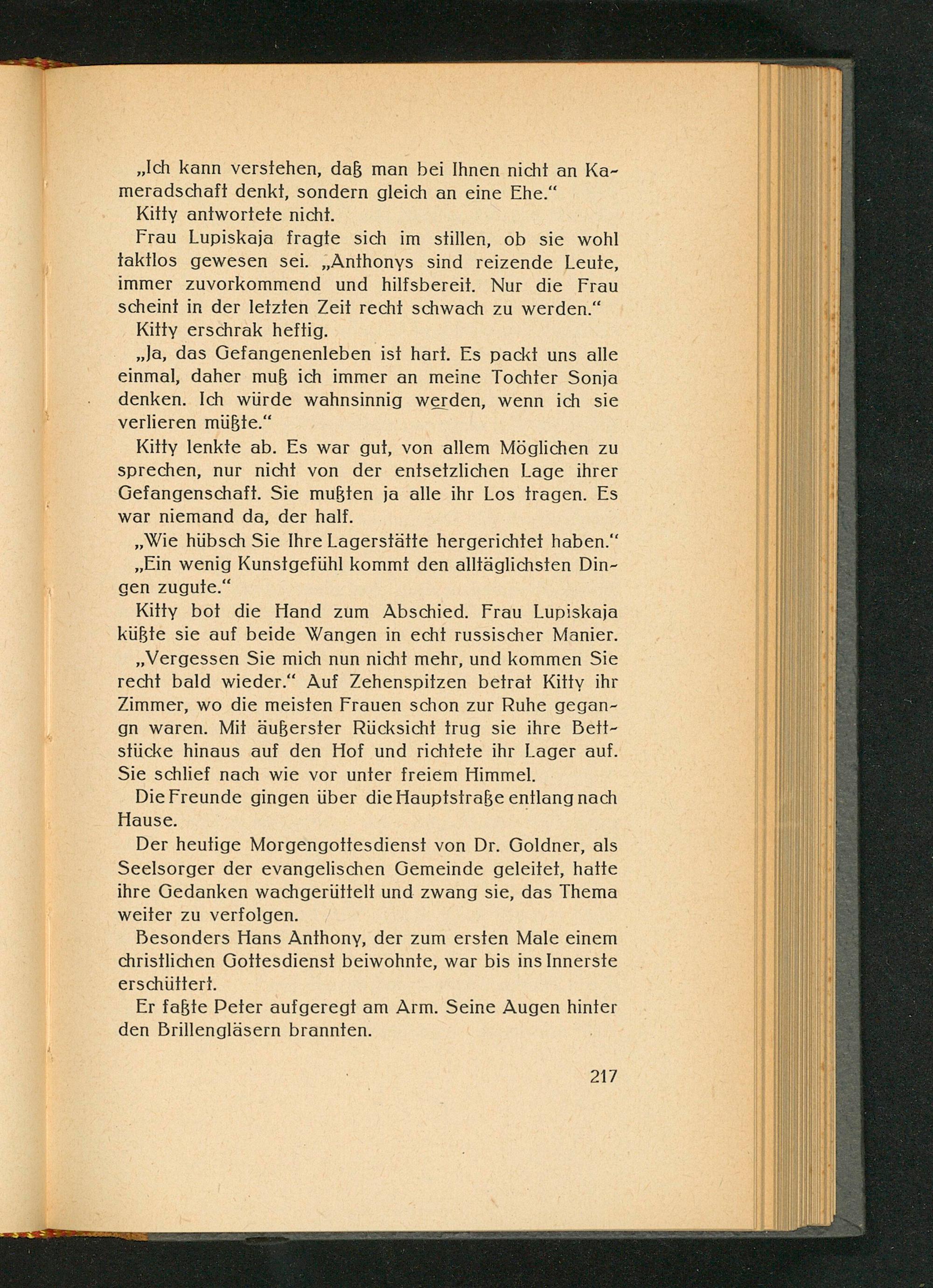 Kitty lenkte ab. Es war gut, von allem Möglichen zu sprechen, nur nicht von der entsetzlichen Lage ihrer Gefangenschaft. Sie mußten ja alle ihr Los tragen. Es war niemand da, der half.