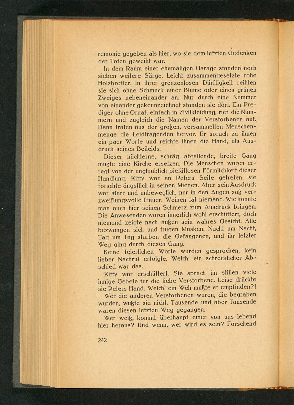 Dieser nüchterne, schräg abfallende, breite Gang mußte eine Kirche ersetzen. Die Menschen waren erregt von der unglaublich pietätlosen Förmlichkeit dieser Handlung. Kitty war an Peters Seite getreten, sie forschte ängstlich in seinen Mienen. Aber sein Ausdruck war starr und unbeweglich, nur in den Augen sak verzweiflungsvolle Trauer. Weinen tat niemand. Wie konnte man auch hier seinen Schmerz zum Ausdruck bringen. Die Anwesenden waren innerlich wohl erschüttert, doch niemand zeigte nach außen sein wahres Gesicht. Alle bezwangen sich und trugen Masken. Nacht um Nacht, Tag um Tag starben die Gefangenen, und ihr letzter Weg ging durch diesen Gang.
