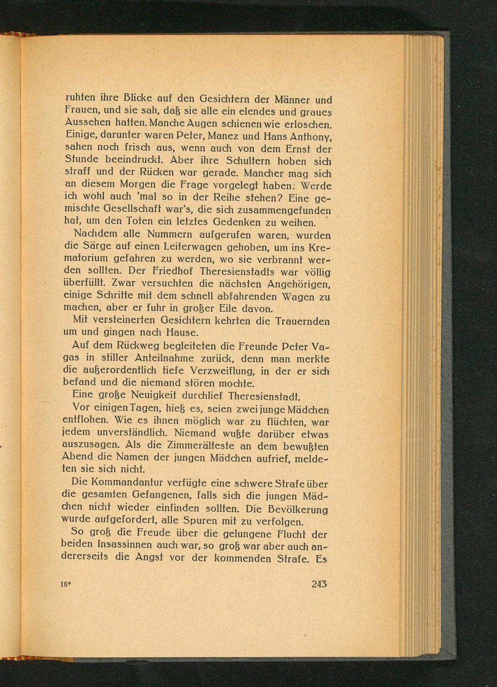 Nachdem alle Nummern aufgerufen waren, wurden die Särge auf einen Leiterwagen gehoben, um ins Krematorium gefahren zu werden, wo sie verbrannt werden sollten. Der Friedhof Theresienstadts war völlig überfüllt. Zwar versuchten die nächsten Angehörigen, einige Schritte mit dem schnell abfahrenden Wagen zu machen, aber er fuhr in großer Eile davon.