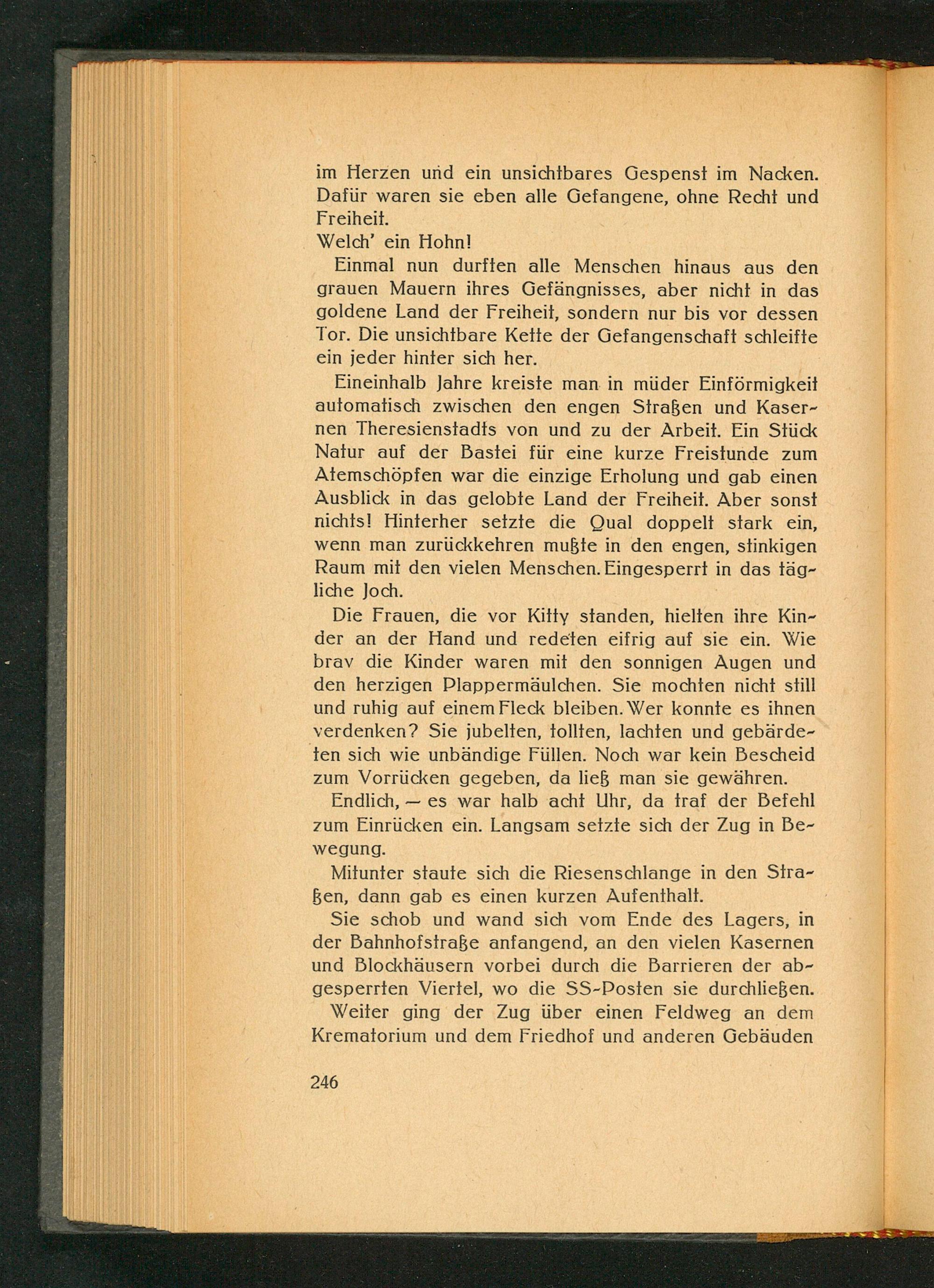 Eineinhalb Jahre kreiste man in müder Einförmigkeit automatisch zwischen den engen Straßen und Kasernen Theresienstadts von und zu der Arbeit. Ein Stück Natur auf der Bastei für eine kurze Freistunde zum Atemschöpfen war die einzige Erholung und gab einen Ausblick in das gelobte Land der Freiheit. Aber sonst nichts! Hinterher setzte die Qual doppelt stark ein, wenn man zurückkehren mußte in den engen, stinkigen Raum mit den vielen Menschen. Eingesperrt in das tägliche Joch.