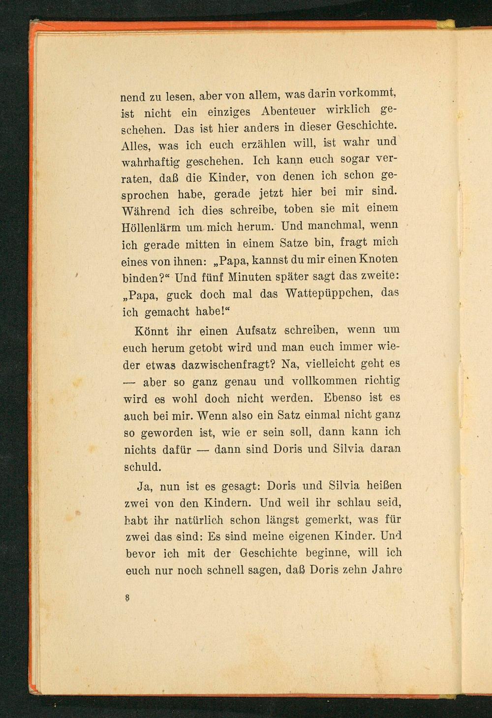 nend zu lesen, aber von allem, was darin vorkommt, ist nicht ein einziges Abenteuer wirklich geschehen. Das ist hier anders in dieser Geschichte. Alles, was ich euch erzählen will, ist wahr und wahrhaftig geschehen. Ich kann euch sogar verraten, daß die Kinder, von denen ich schon gesprochen habe, gerade jetzt hier bei mir sind. Während ich dies schreibe, toben sie mit einem Höllenlärm um mich herum. Und manchmal, wenn ich gerade mitten in einem Satze bin, fragt mich eines von ihnen:„ Papa, kannst du mir einen Knoten binden? Und fünf Minuten später sagt das zweite: ,, Papa, guck doch mal das Wattepüppchen, das ich gemacht habe!"