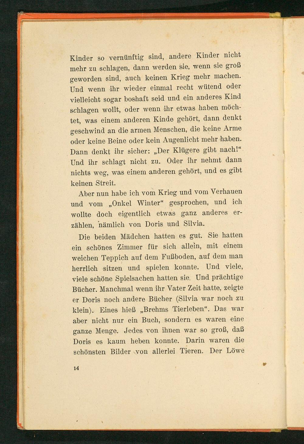 Die beiden Mädchen hatten es gut. Sie hatten ein schönes Zimmer für sich allein, mit einem weichen Teppich auf dem Fußboden, auf dem man herrlich sitzen und spielen konnte. Und viele, viele schöne Spielsachen hatten sie. Und prächtige Bücher. Manchmal wenn ihr Vater Zeit hatte, zeigte er Doris noch andere Bücher( Silvia war noch zu klein). Eines hieß Brehms Tierleben ". Das war aber nicht nur ein Buch, sondern es waren eine ganze Menge. Jedes von ihnen war so groß, daß Doris es kaum heben konnte. Darin waren die schönsten Bilder von allerlei Tieren. Der Löwe