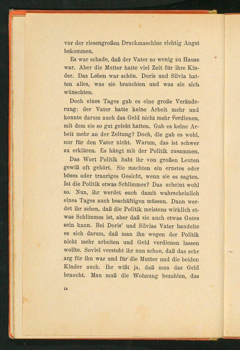 Das Wort Politik habt ihr von großen Leuten gewiß oft gehört. Sie machten ein ernstes oder böses oder trauriges Gesicht, wenn sie es sagten. Ist die Politik etwas Schlimmes? Das scheint wohl so. Nun, ihr werdet euch damit wahrscheinlich eines Tages auch beschäftigen müssen. Dann werdet ihr sehen, daß die Politik meistens wirklich etwas Schlimmes ist, aber daß sie auch etwas Gutes sein kann. Bei Doris' und Silvias Vater handelte es sich darum, daß man ihn wegen der Politik nicht mehr arbeiten und Geld verdienen lassen wollte. Soviel versteht ihr nun schon, daß das sehr arg für ihn war und für die Mutter und die beiden Kinder auch. Ihr wiẞt ja, daß man das Geld braucht. Man muß die Wohnung bezahlen, das