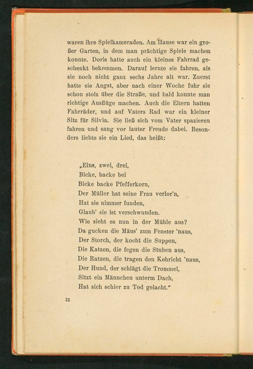 waren ihre Spielkameraden. Am Hause war ein groBer Garten, in dem man prächtige Spiele machen konnte. Doris hatte auch ein kleines Fahrrad geschenkt bekommen. Darauf lernte sie fahren, als sie noch nicht ganz sechs Jahre alt war. Zuerst hatte sie Angst, aber nach einer Woche fuhr sie schon stolz über die Straße, und bald konnte man richtige Ausflüge machen. Auch die Eltern hatten. Fahrräder, und auf Vaters Rad war ein kleiner Sitz für Silvia. Sie ließ sich vom Vater spazieren fahren und sang vor lauter Freude dabei. Besonders liebte sie ein Lied, das heißt: