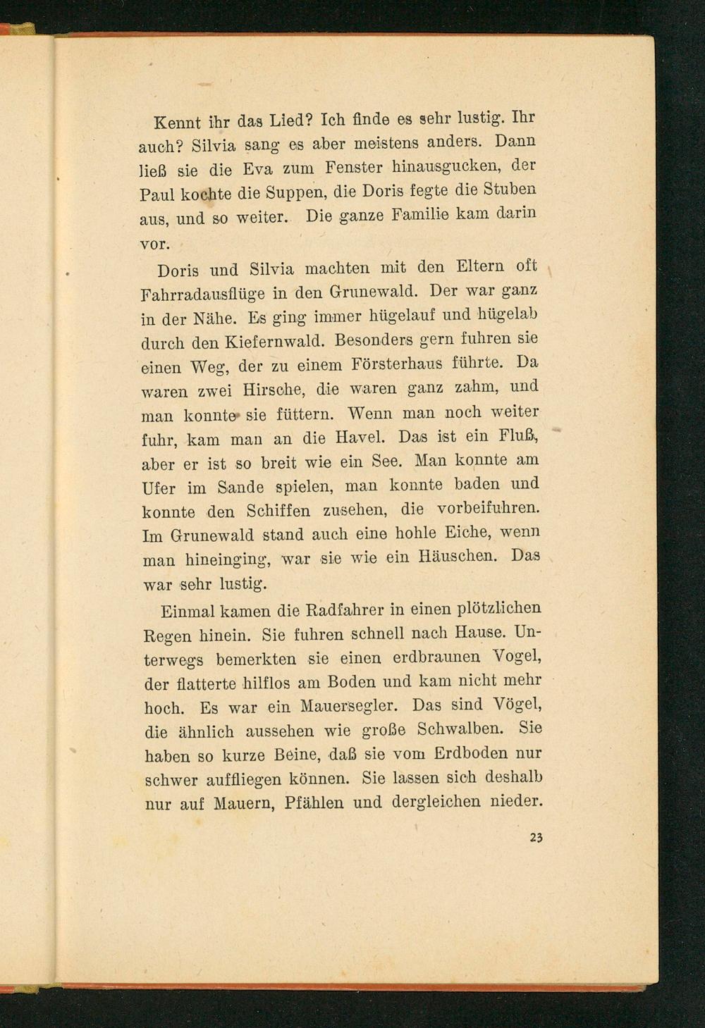 Doris und Silvia machten mit den Eltern oft Fahrradausflüge in den Grunewald . Der war ganz in der Nähe. Es ging immer hügelauf und hügelab durch den Kiefernwald. Besonders gern fuhren sie einen Weg, der zu einem Försterhaus führte. Da waren zwei Hirsche, die waren ganz zahm, und man konnte sie füttern. Wenn man noch weiter fuhr, kam man an die Havel . Das ist ein Fluß, aber er ist so breit wie ein See. Man konnte am Ufer im Sande spielen, man konnte baden und konnte den Schiffen zusehen, die vorbeifuhren. Im Grunewald stand auch eine hohle Eiche, wenn man hineinging, war sie wie ein Häuschen. Das war sehr lustig.