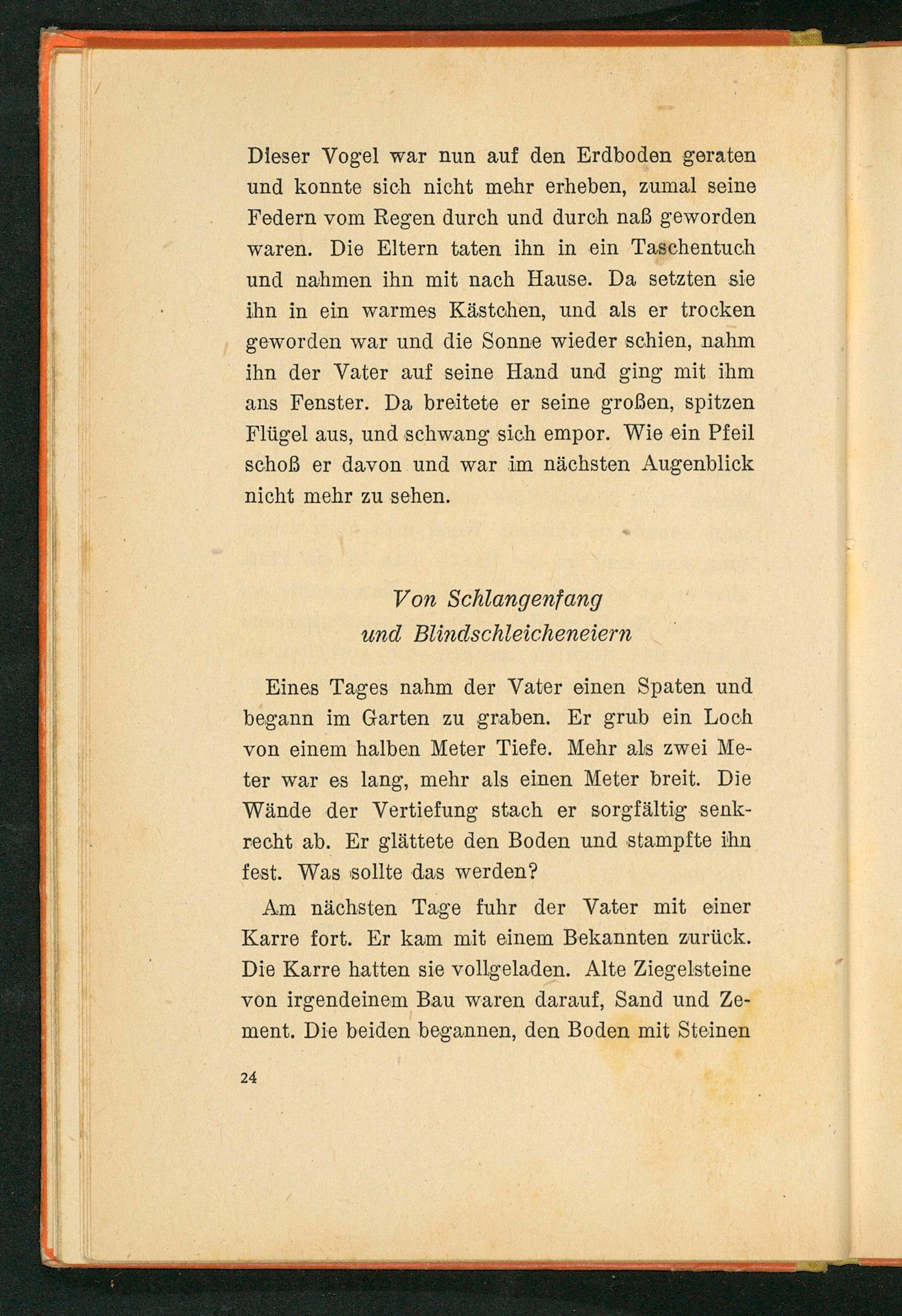Dieser Vogel war nun auf den Erdboden geraten und konnte sich nicht mehr erheben, zumal seine Federn vom Regen durch und durch naß geworden waren. Die Eltern taten ihn in ein Taschentuch und nahmen ihn mit nach Hause. Da setzten sie ihn in ein warmes Kästchen, und als er trocken geworden war und die Sonne wieder schien, nahm ihn der Vater auf seine Hand und ging mit ihm ans Fenster. Da breitete er seine großen, spitzen Flügel aus, und schwang sich empor. Wie ein Pfeil schoß er davon und war im nächsten Augenblick nicht mehr zu sehen.