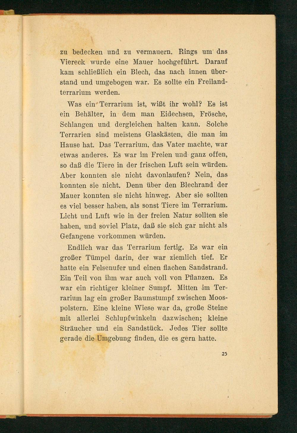 Was ein’ Terrarium ist, wißt ihr wohl? Es ist ein Behälter, in dem man Eidechsen, Frösche, Schlangen und dergleichen halten kann. Solche Terrarien sind meistens Glaskästen, die man im Hause hat. Das Terrarium, das Vater machte, war etwas anderes. Es war im Freien und ganz offen, so daß die Tiere in der frischen Luft sein würden. Aber konnten sie nicht davonlaufen? Nein, das konnten sie nicht. Denn über den Blechrand der Mauer konnten sie nicht hinweg. Aber sie sollten es viel besser haben, als sonst Tiere im Terrarium. Licht und Luft wie in der freien Natur sollten sie haben, und soviel Platz, daß sie sich gar nicht als Gefangene vorkommen würden.