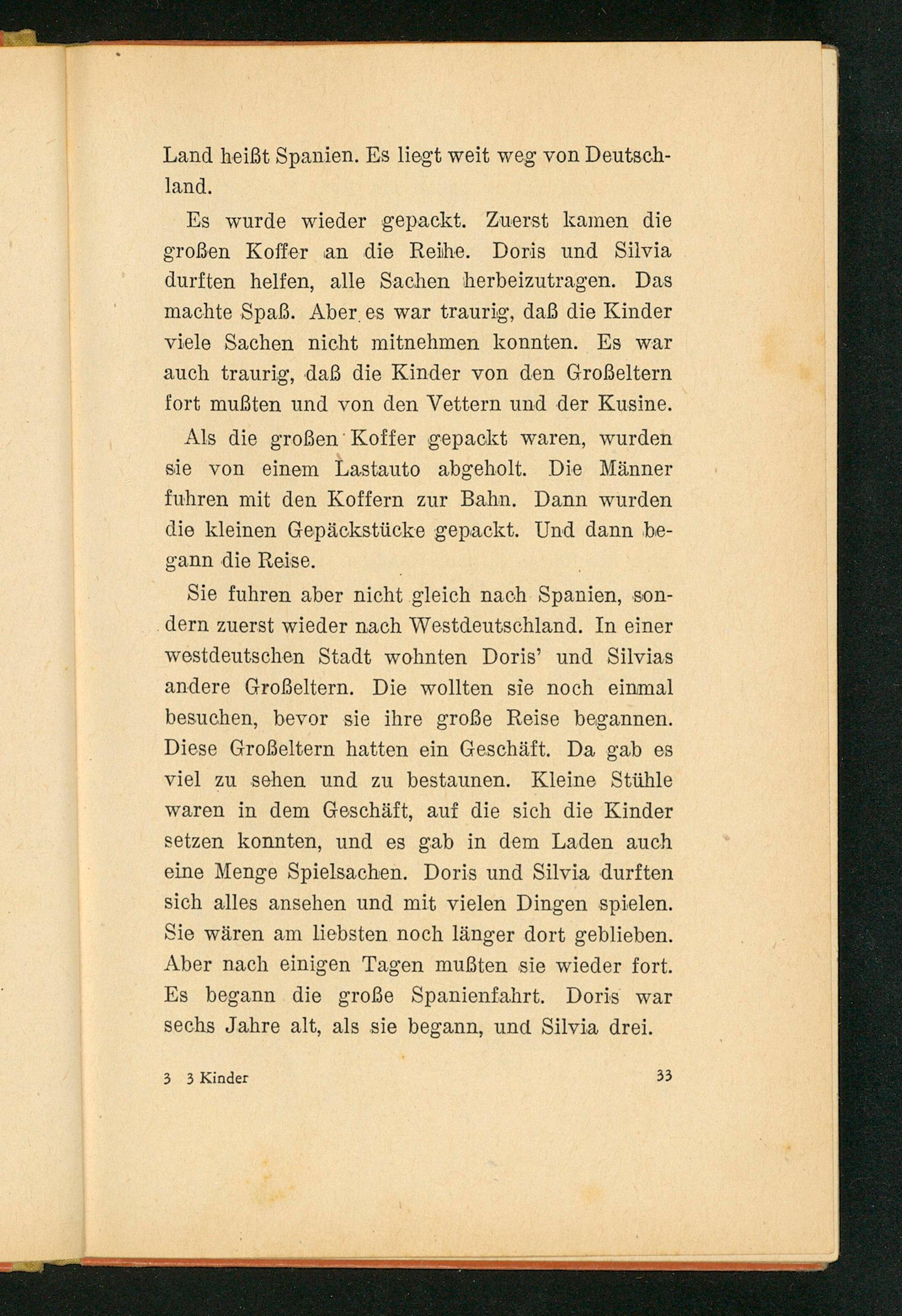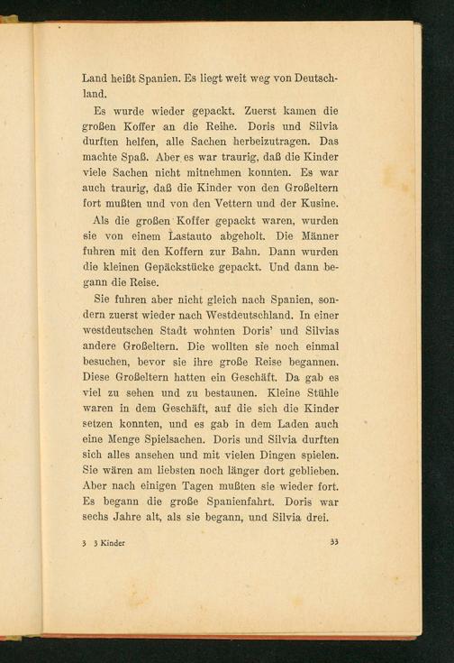 Sie fuhren aber nicht gleich nach Spanien , sondern zuerst wieder nach Westdeutschland. In einer westdeutschen Stadt wohnten Doris' und Silvias andere Großeltern. Die wollten sie noch einmal besuchen, bevor sie ihre große Reise begannen. Diese Großeltern hatten ein Geschäft. Da gab es viel zu sehen und zu bestaunen. Kleine Stühle waren in dem Geschäft, auf die sich die Kinder setzen konnten, und es gab in dem Laden auch eine Menge Spielsachen. Doris und Silvia durften sich alles ansehen und mit vielen Dingen spielen. Sie wären am liebsten noch länger dort geblieben. Aber nach einigen Tagen mußten sie wieder fort. Es begann die große Spanienfahrt. Doris war sechs Jahre alt, als sie begann, und Silvia drei.
