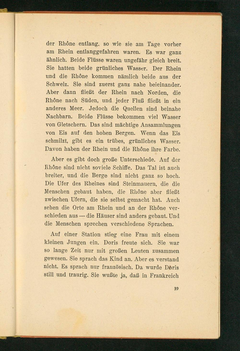 Aber es gibt doch große Unterschiede. Auf der Rhöne sind nicht soviele Schiffe. Das Tal ist auch breiter, und die Berge sind nicht ganz so hoch. Die Ufer des Rheines sind Steinmauern, die die Menschen gebaut haben, die Rhöne aber fließt zwischen Ufern, die sie selbst gemacht hat. Auch sehen die Orte am Rhein und an der Rhöne ver- schieden aus— die Häuser sind anders gebaut. Und die Menschen sprechen verschiedene Sprachen.