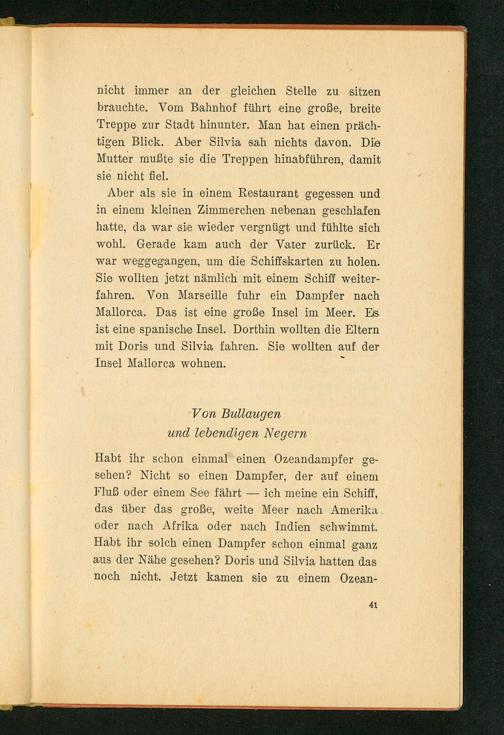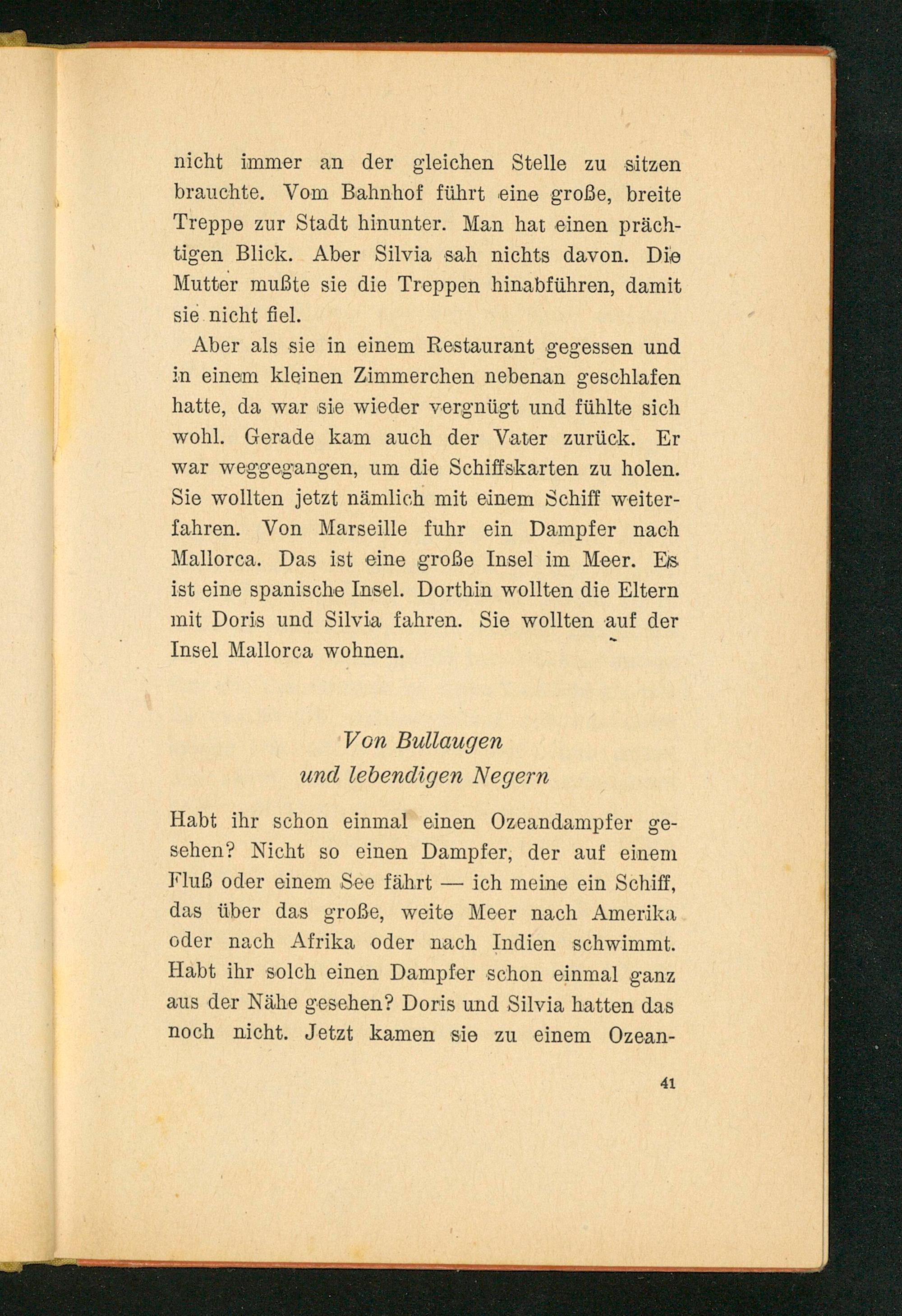 Aber als sie in einem Restaurant gegessen und in einem kleinen Zimmerchen nebenan geschlafen hatte, da war sie wieder vergnügt und fühlte sich wohl. Gerade kam auch der Vater zurück. Er war weggegangen, um die Schiffskarten zu holen. Sie wollten jetzt nämlich mit einem Schiff weiterfahren. Von Marseille fuhr ein Dampfer nach Mallorca . Das ist eine große Insel im Meer. Es ist eine spanische Insel. Dorthin wollten die Eltern mit Doris und Silvia fahren. Sie wollten auf der Insel Mallorca wohnen.