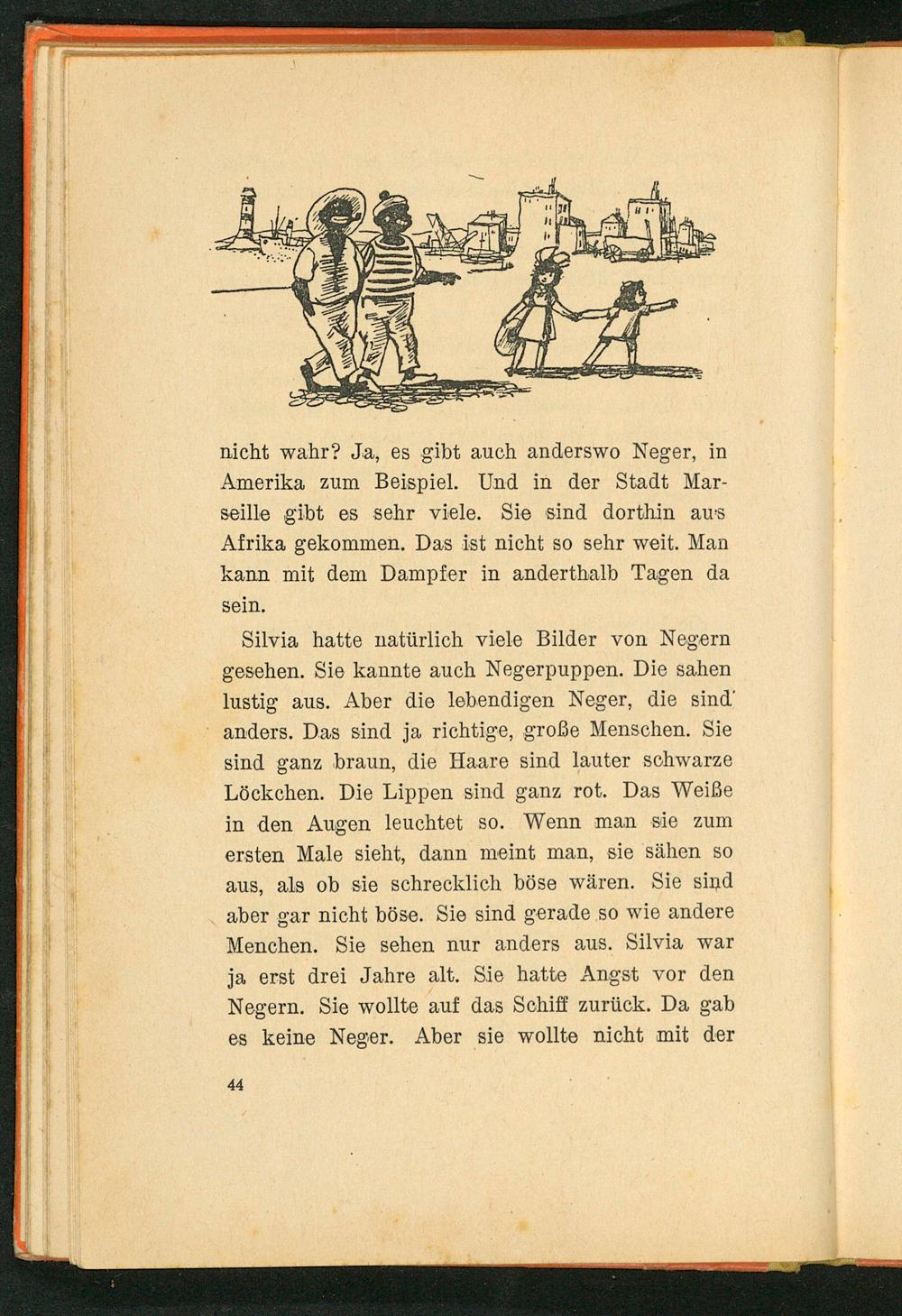 Silvia hatte natürlich viele Bilder von Negern gesehen. Sie kannte auch Negerpuppen. Die sahen lustig aus. Aber die lebendigen Neger, die sind anders. Das sind ja richtige, große Menschen. Sie sind ganz braun, die Haare sind lauter schwarze Löckchen. Die Lippen sind ganz rot. Das Weiße in den Augen leuchtet so. Wenn man sie zum ersten Male sieht, dann meint man, sie sähen so aus, als ob sie schrecklich böse wären. Sie sind aber gar nicht böse. Sie sind gerade so wie andere Menchen. Sie sehen nur anders aus. Silvia war ja erst drei Jahre alt. Sie hatte Angst vor den Negern. Sie wollte auf das Schiff zurück. Da gab es keine Neger. Aber sie wollte nicht mit der